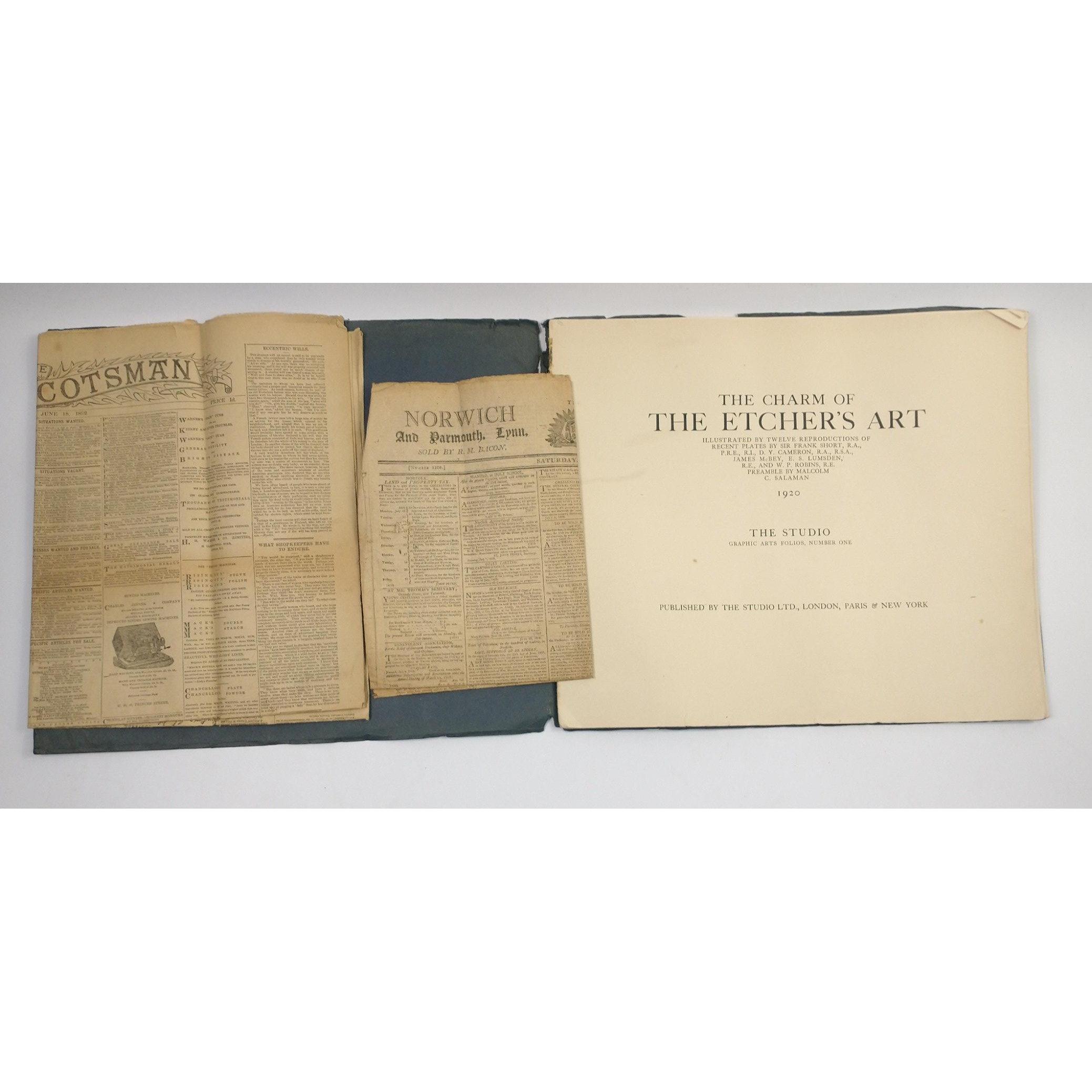 The Charm of the Etcher's Art, preamble by Malcolm C Salaman, number one, published by The Studio, London 1920 with 10 plates by Frank Short, DY Cameron, James McBey, ES Lumsden, WP Robins, soft cover showing signs of wear, plates all in good condition, plus a copy of The Weekly Scotsman from 1892 and The Norwich Mercury from 1809