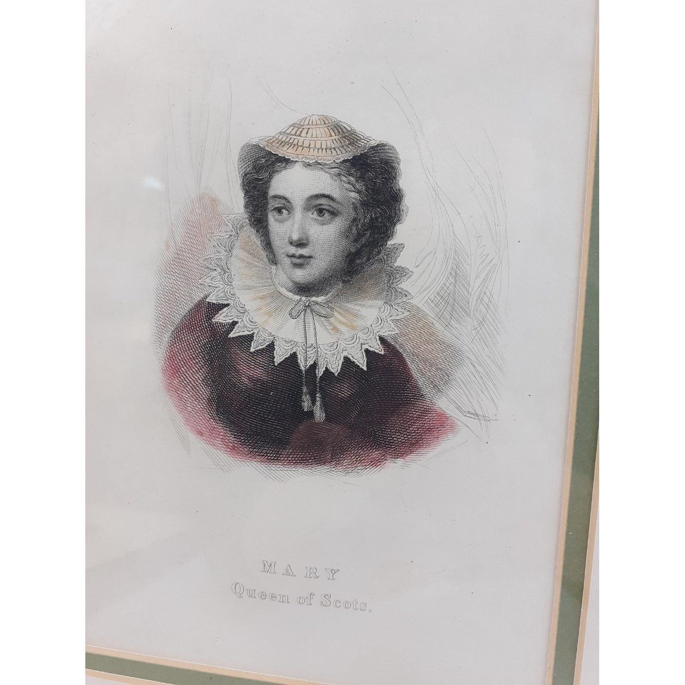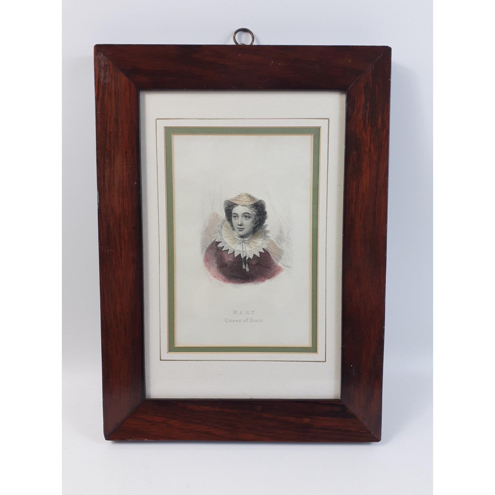A framed print of MARY QUEEN OF SCOTS. Hand coloured and likely a Victoria book plate. Presented in an older solid attractive frame. Frame size 36 x 26cm approx.