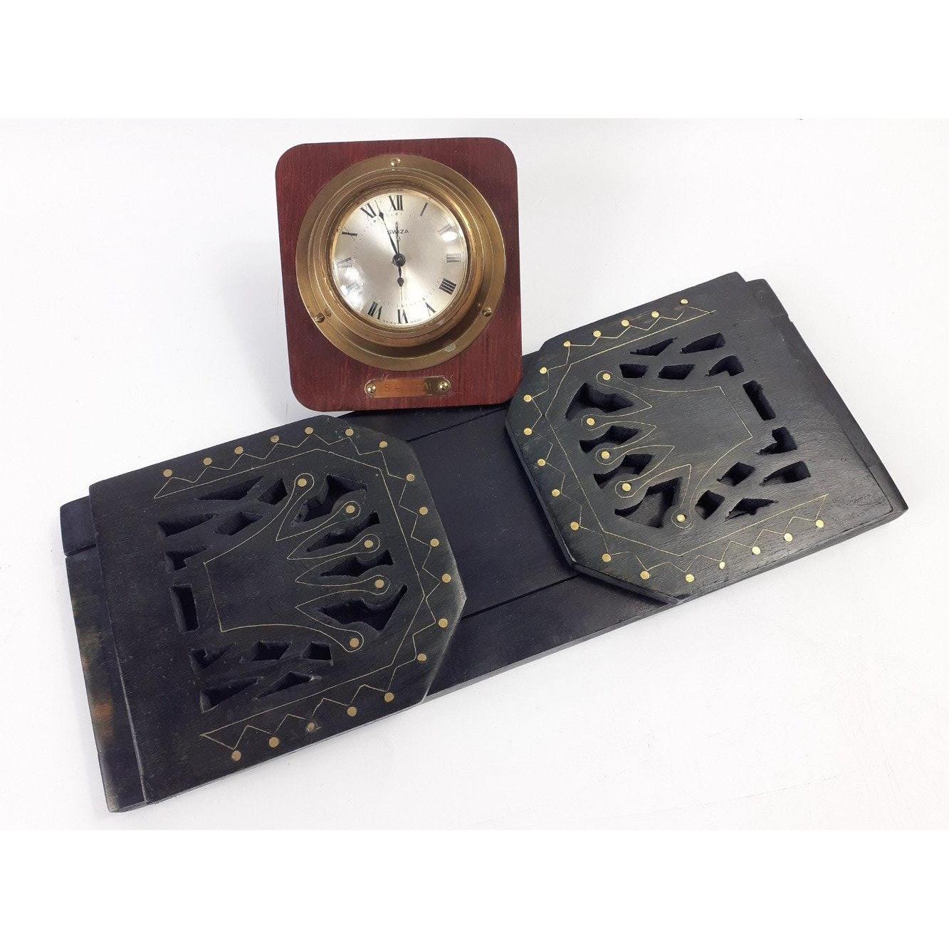 A black ebony book slide 32cm long and a SWIZA nautical clock (needs attention) 10x12cm approxApprox 2 pieces