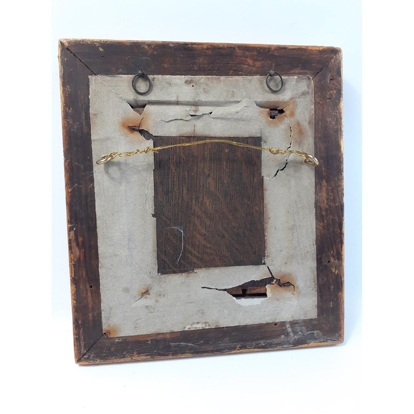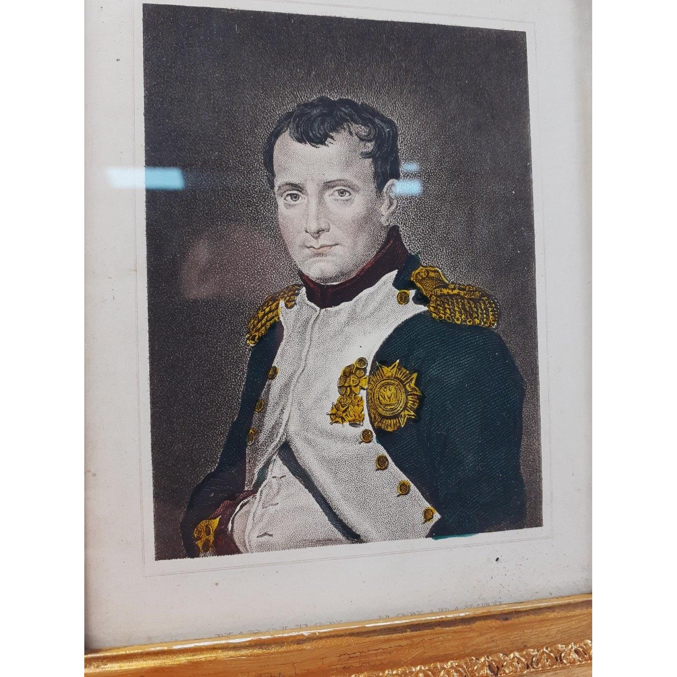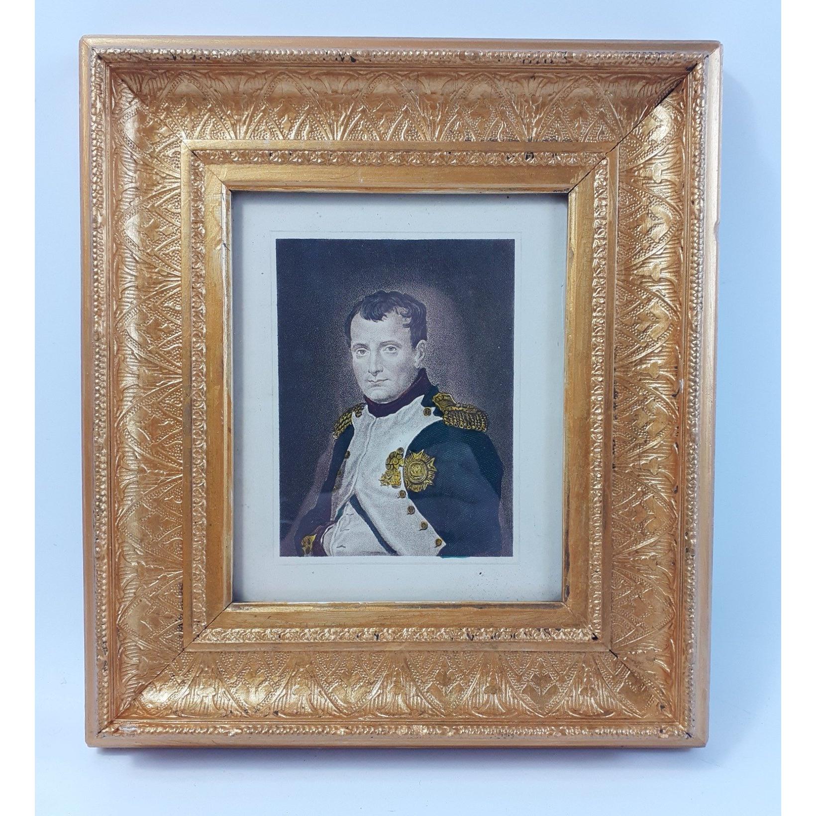A super older framed print of Napoleon in a lovely very old heavy oak backed gilt frame. Measures 28 x 24 cm approx .