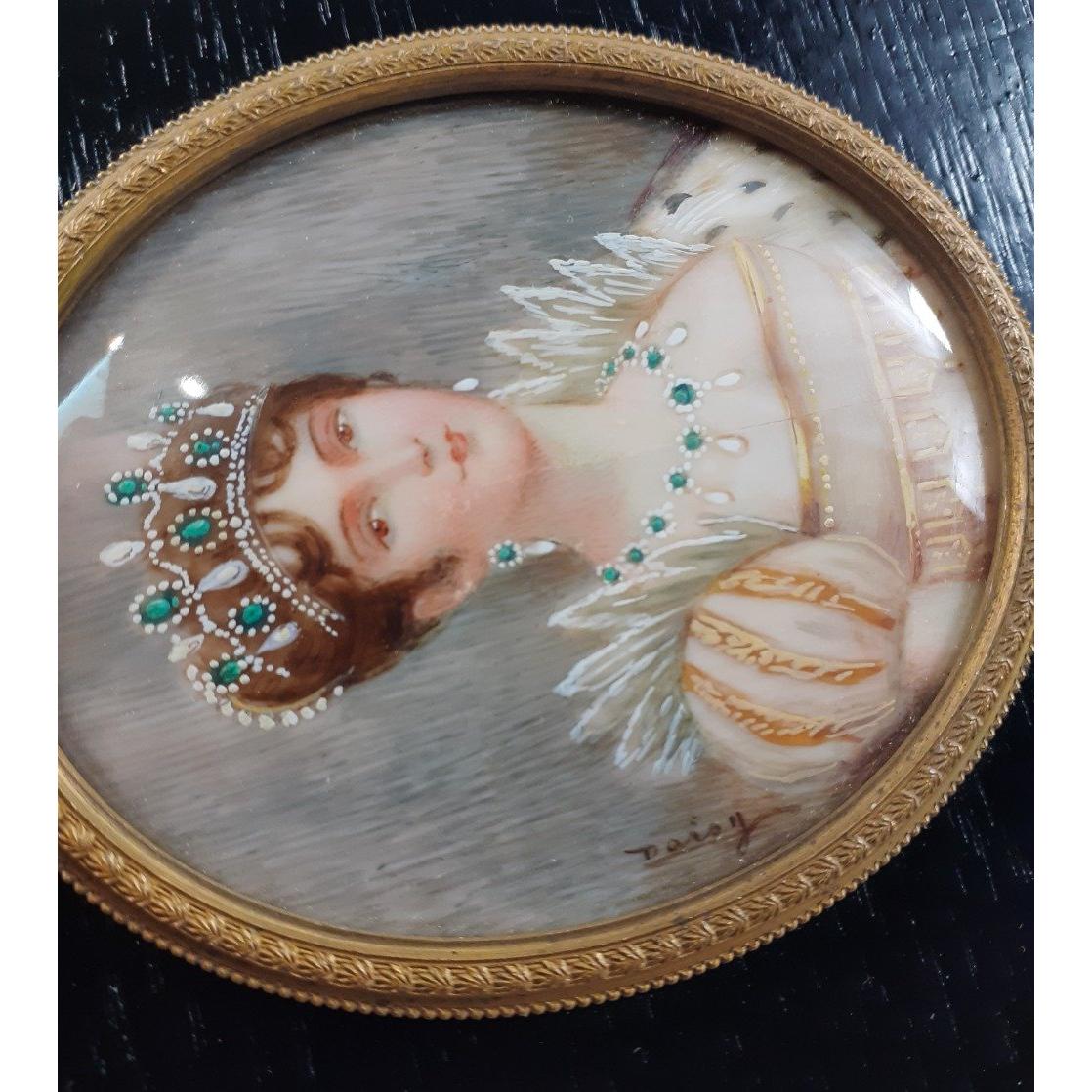 A really quite delightful hand painted signed miniature of EMPRESS JOSEPHINE. Age uncertain likely late nineteenth century, name seems to say DAISY. In a fairly modern wooden frame. Composition of item uncertain but there does appear to be small crack in the surface. A very interesting and intriguing item. Total frame size 13 x 12 cm approx