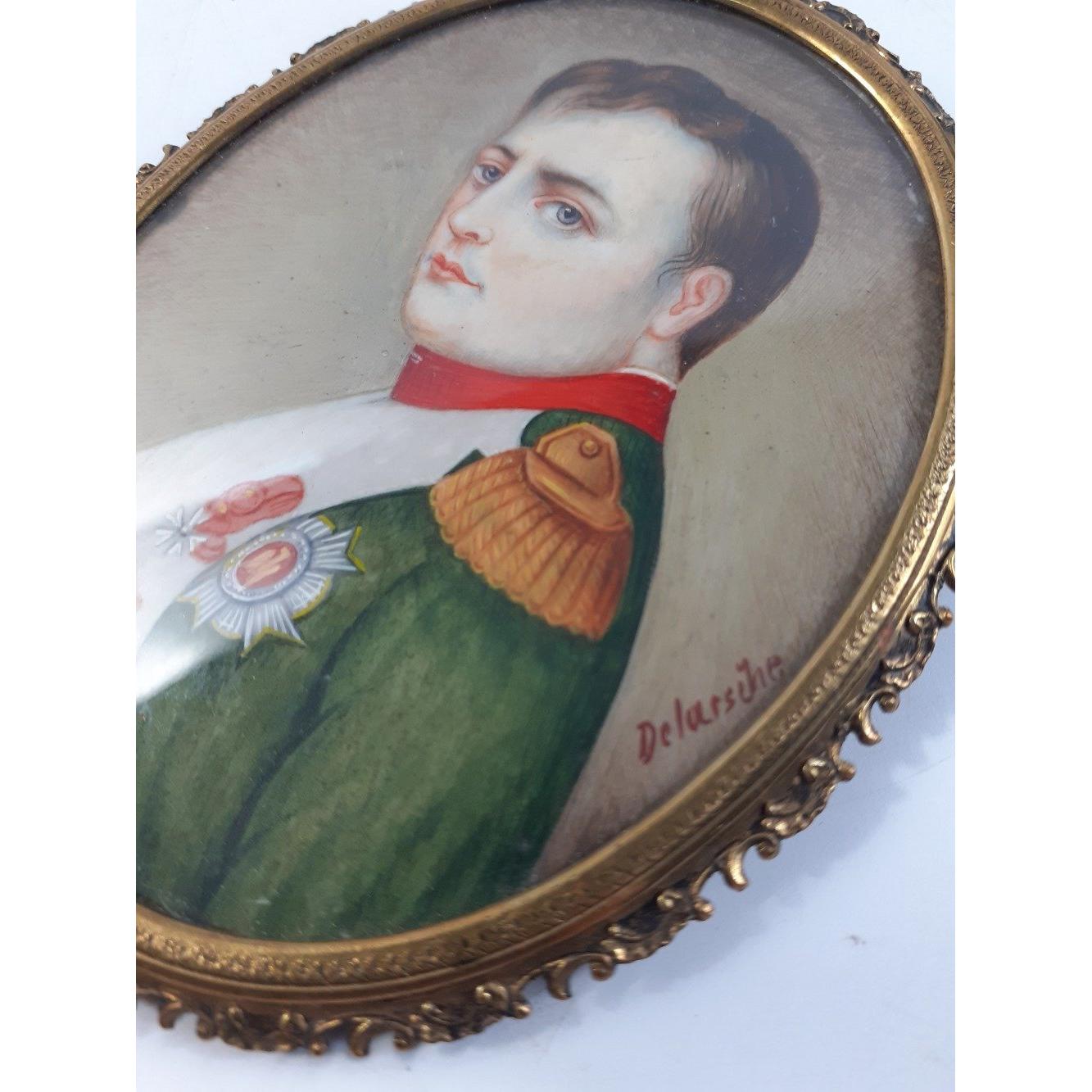 A super little late nineteenth century hand painted miniature portrait of Napoleon Bonaparte in an old gilt frame. Indistinct signture, looks like Delarsche ? Older gilt edged frame. Measures 10 x 7 cm approx