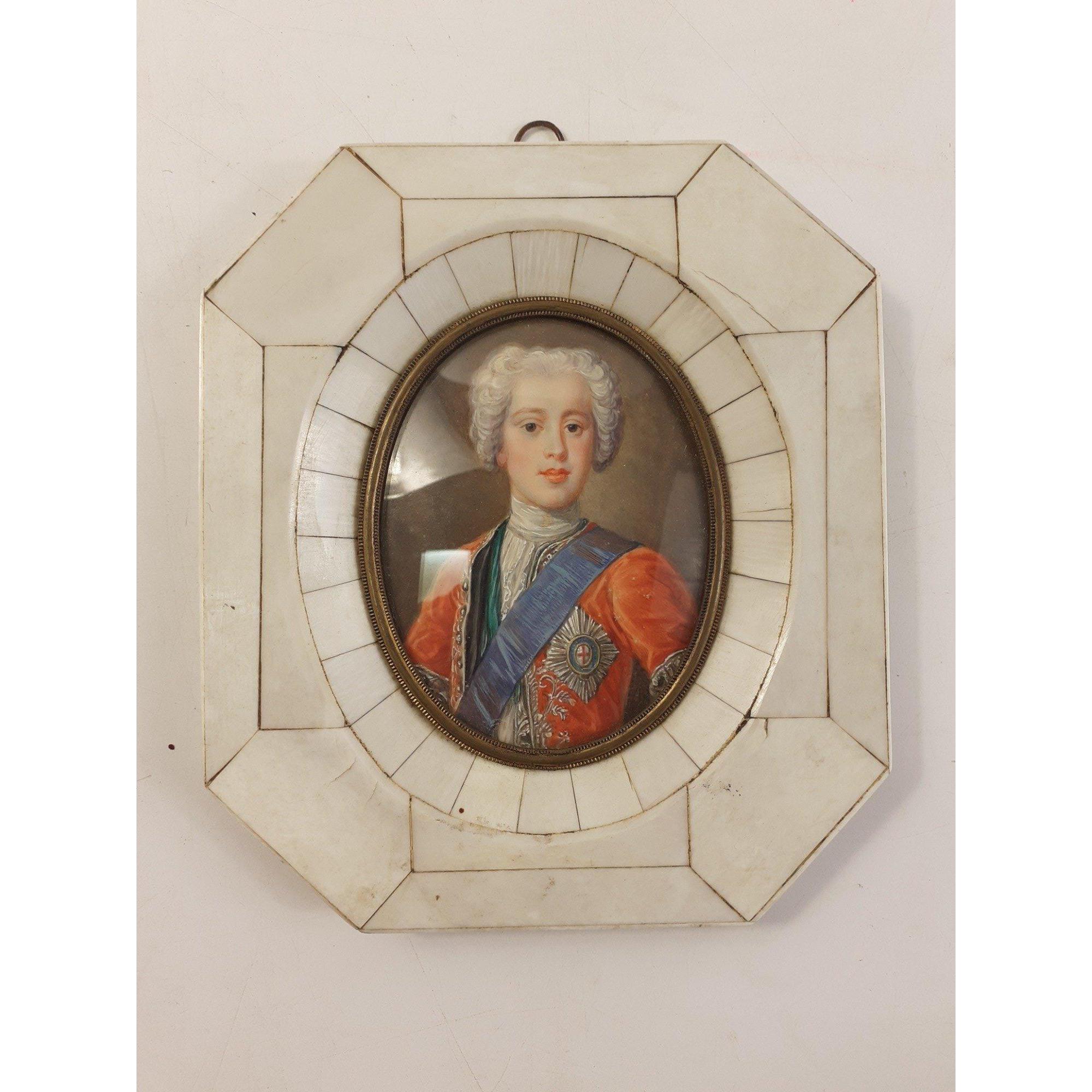 A Victorian piano key style frame with a lovely miniature hand painted portrait of CHARLES EDWARD STUART, Bonnie Prince Charlie. Very well executed and with an indistinct signature. A truly exquisite little picture. Total frame size 15 x 13cm approx.