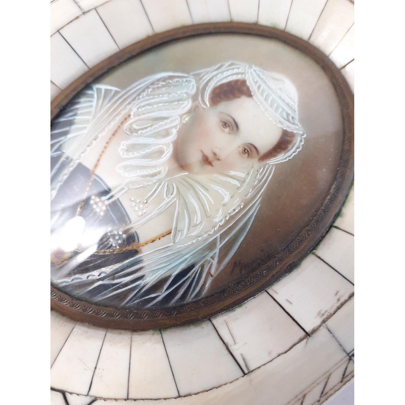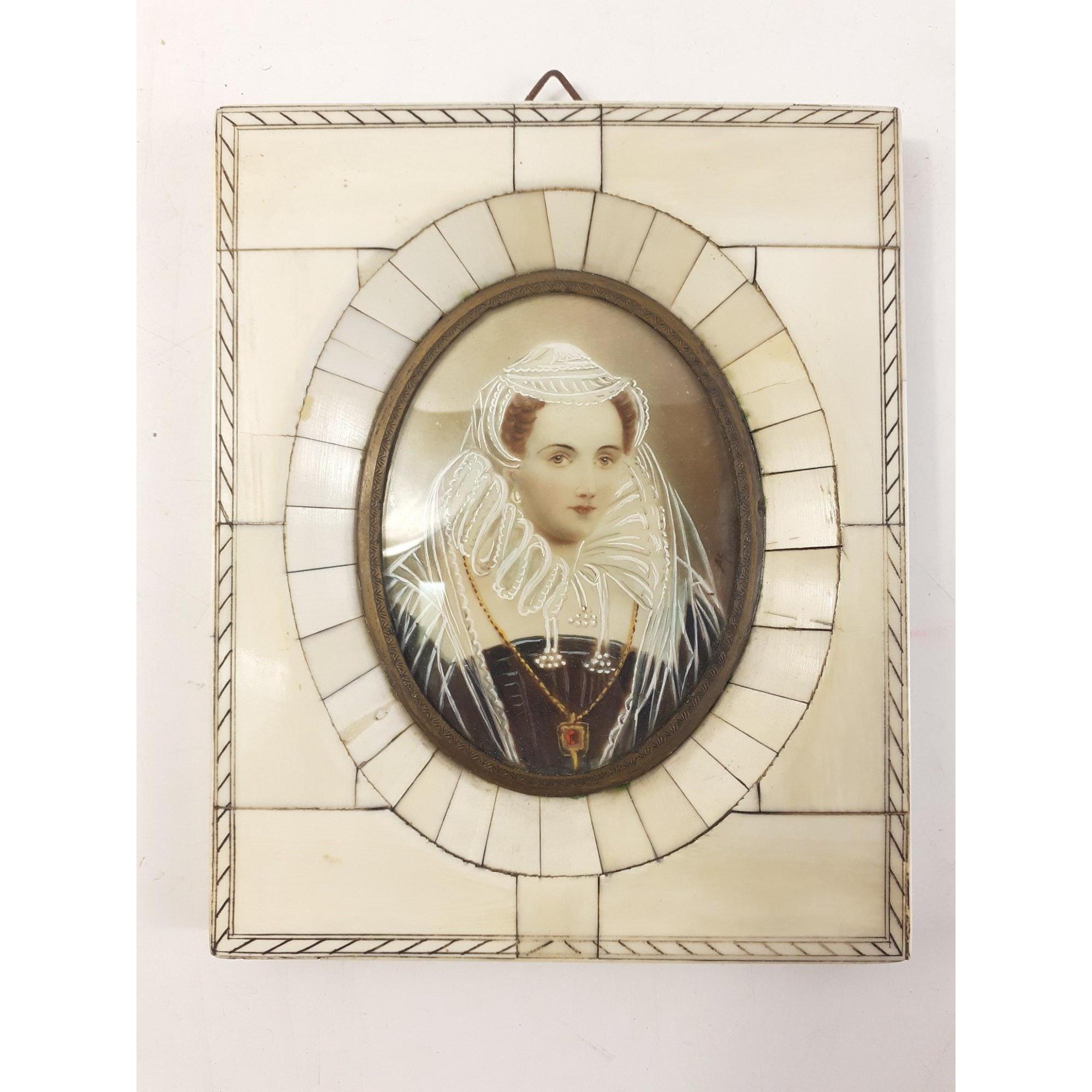 An attractive Victorian Piano key miniature portrait of MARY QUEEN OF SCOTS. Hand painted and with an indistinct signature. Displays beautifully. Total frame measurement 15 x 12 cm approx