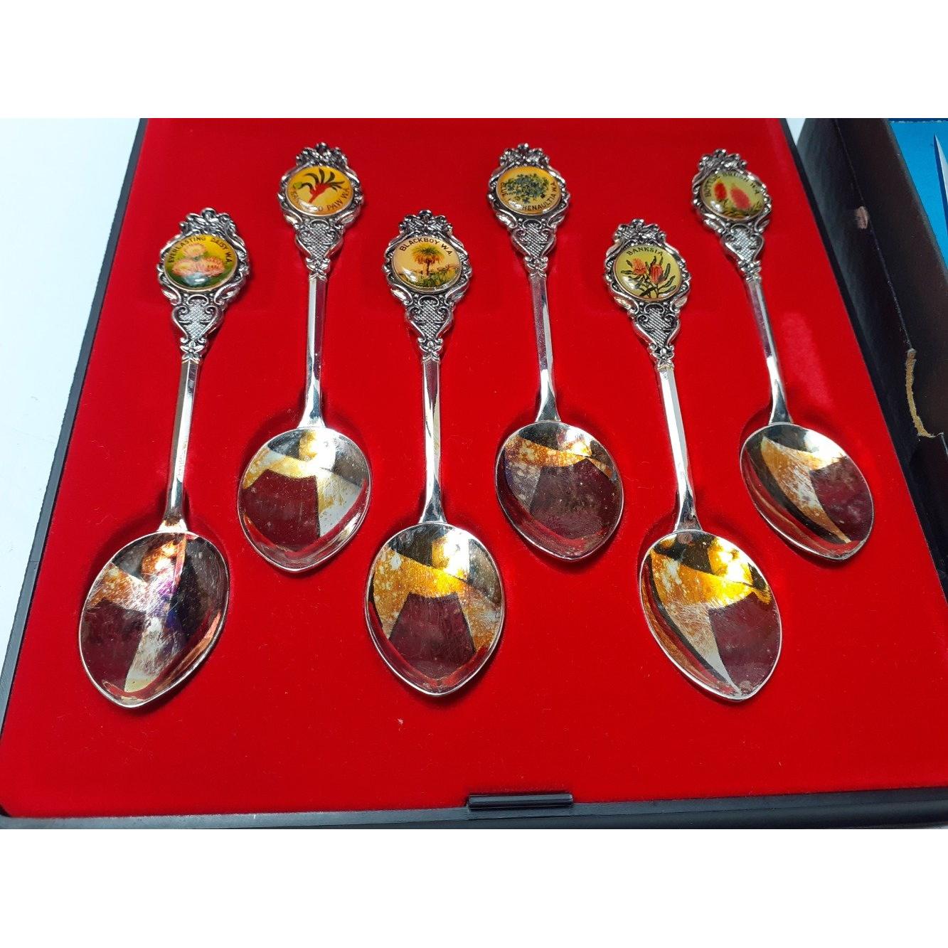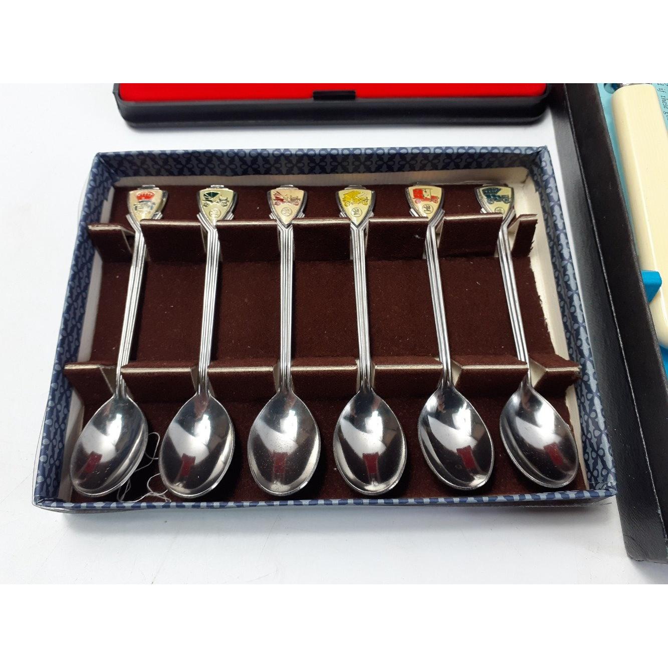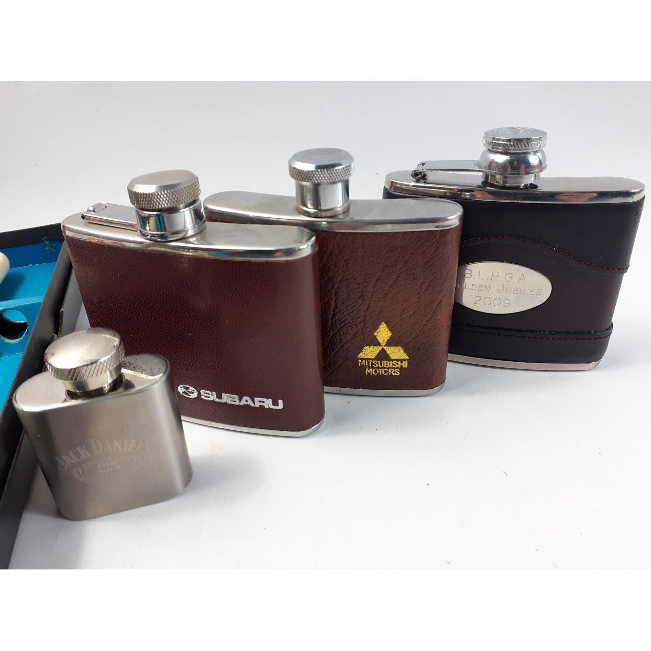 Motoring memorabilia to include 4 oz hip flasks with leather covers and logos for Subaru, Mitsubishi, a 1oz Jack Daniels hip flask, and a set of 6 decorative spoons with vintage cars, plus a boxed VINER'S carving knife and fork and a set of six coffee spoons detailing the flowers of of Western Australia