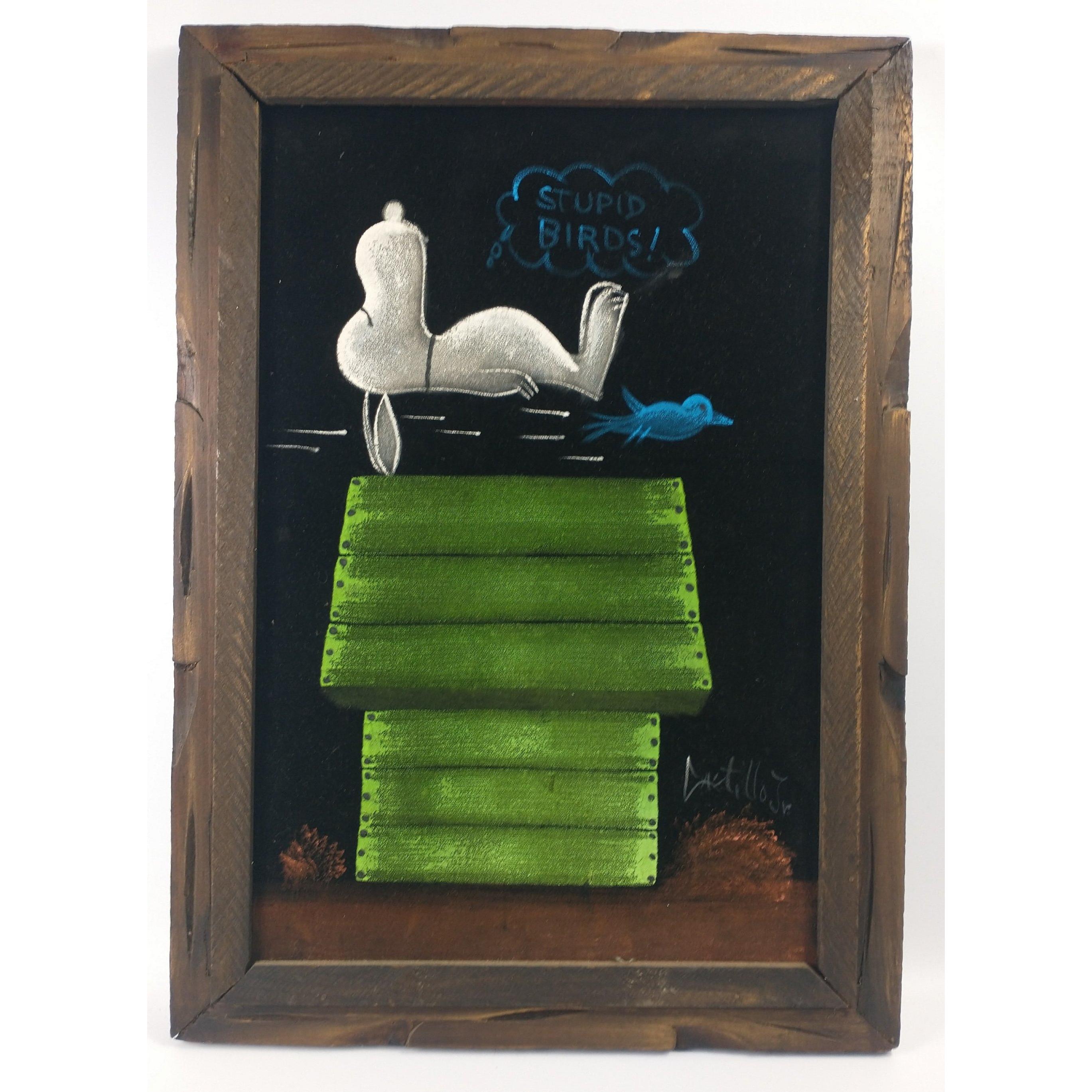 A retro SNOOPY painting on black velvet signed by CASTILLO JR in a wooden frame which measures 53x38cmApprox 1 pieces