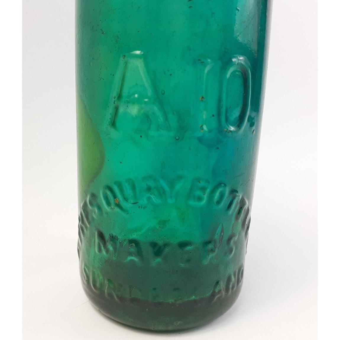 LOCAL SUNDERLAND INTEREST . A lovely green CODD bottle by T FENWICK Monkwearmouth. A10 Makers Ayres Quay Bottle Co. Sunderland. Nice light green marble in place and no damage to neck. Stands 22cm high approx. A lovely example.