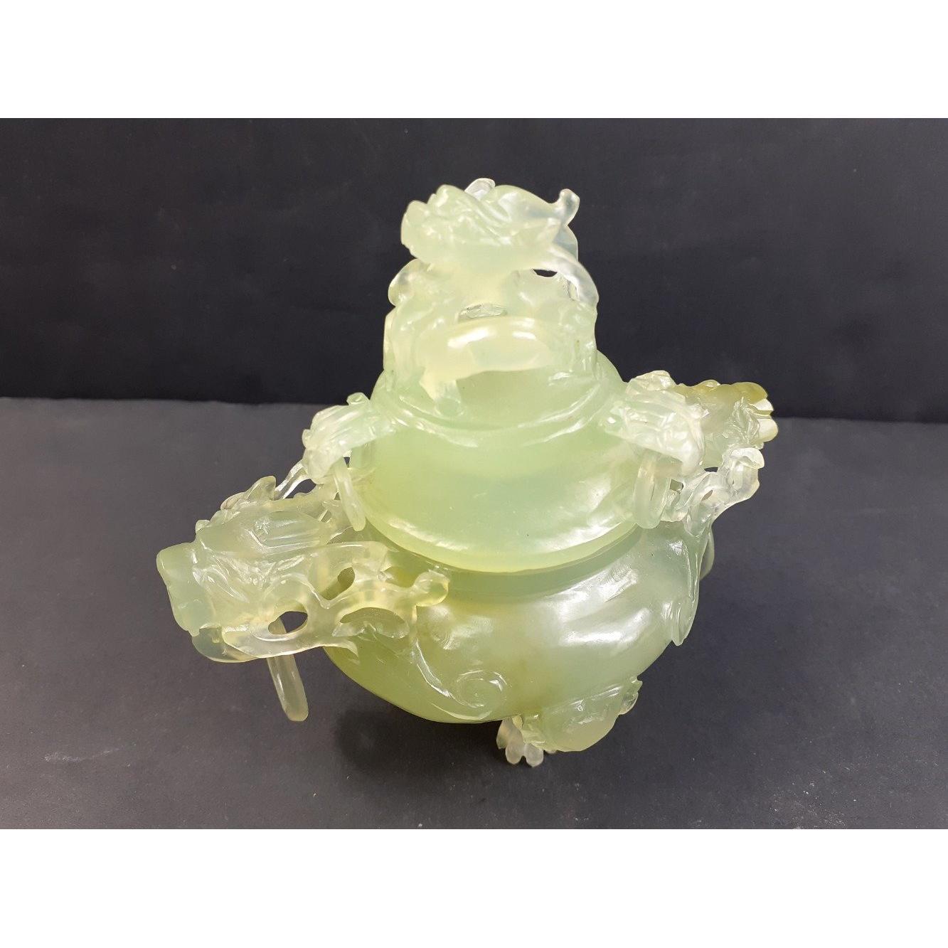 A gorgeous small Japanese GREEN JADE tripod censer and cover in stunning condition. Stands 11cm tall to top of dragon finial. Displays beautifully.