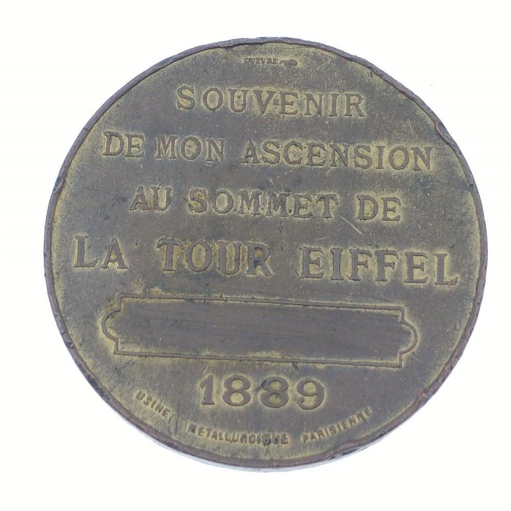 ZUT ALORS !! An 1889 Bronze EIFFEL TOWER souvenir medal commemorating the Ascension to the Summit of the tower and the idea was that your name could be inscribed in the space on the reverse. This one is blank. Nicely struck with super Parisian skyline on the obverse. 42mm