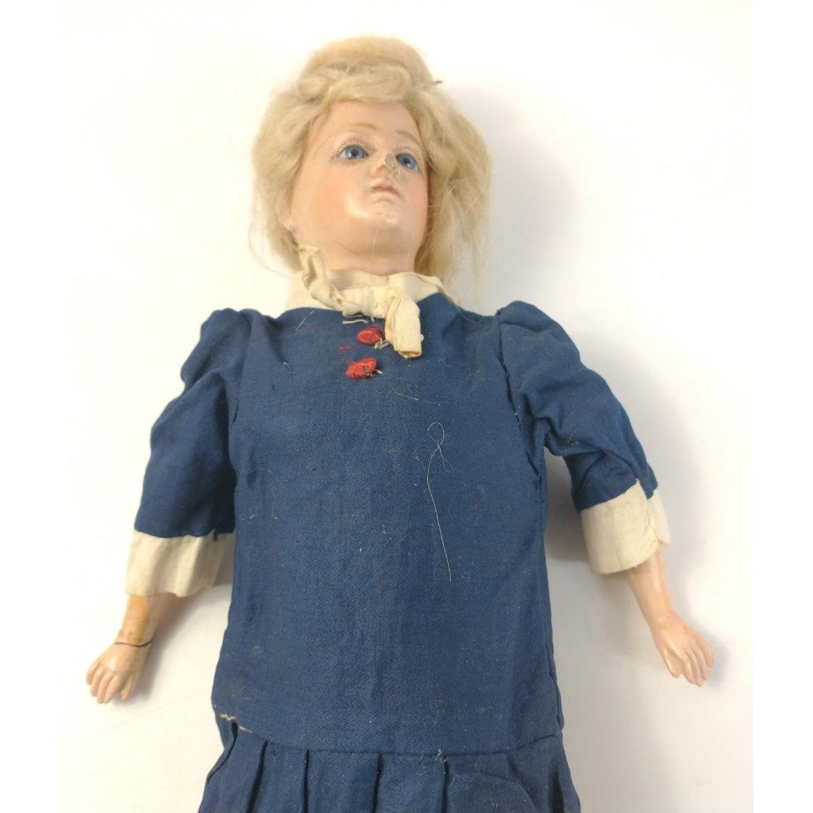A small vintage composite doll 38cm high approx with soft body and hard limbs and face. Particularly nicely done legs with Edwardian style boots and a very pleasant pretty face with real hair. Slight damage to nose, clothing may be original. A lovely little doll. Indistinct mark to neck piece.