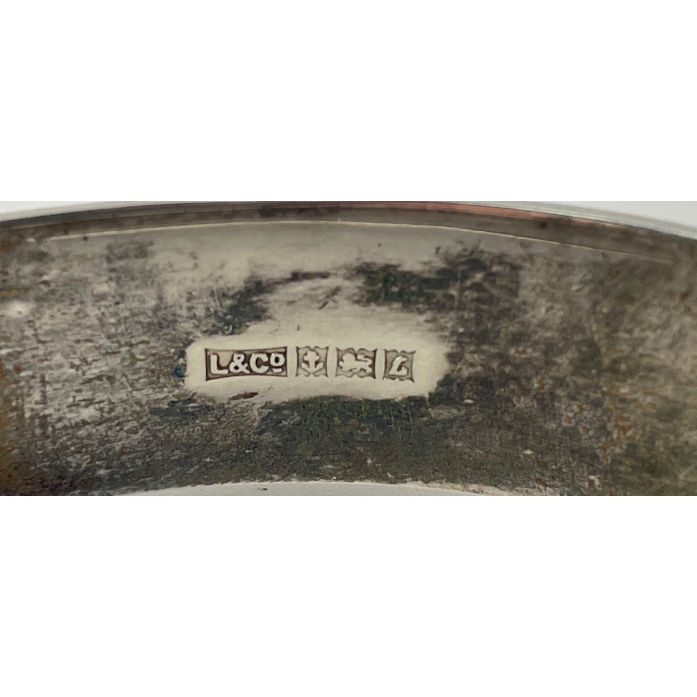 AN ANTIQUE Lion hallmarked snap-shut silver bangle with swirly foliage decoration and comes with a safety chain - 6.5cm diameter approx - weight 23.60g approx - comes with original jewellers' box