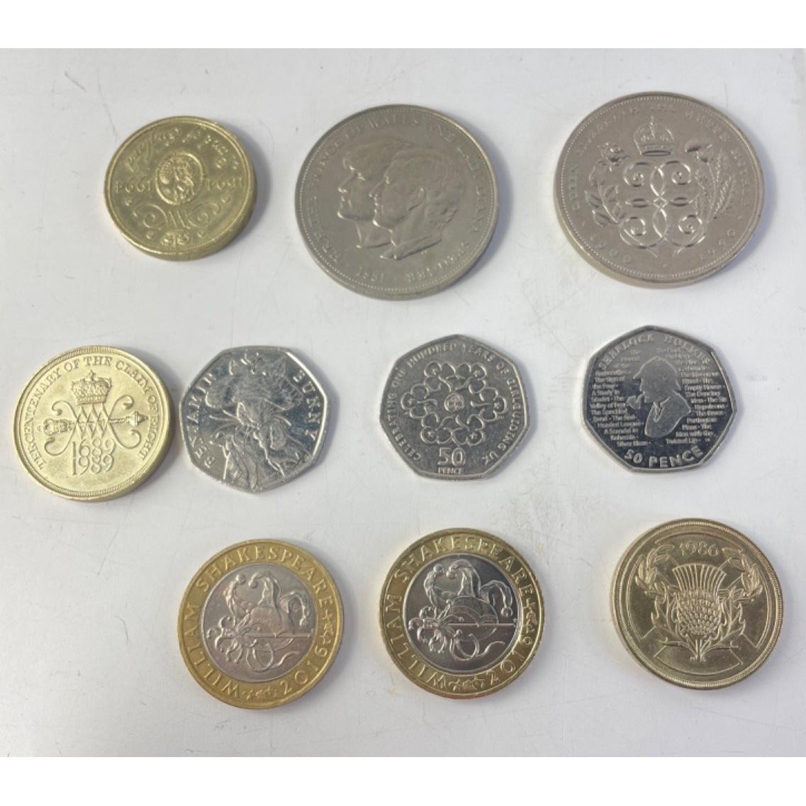A small collection of stamps and coins to include 2 first day covers of Prince and Princess of Wales wedding, a set of Scottish parliament stamps, and various commemorative coins including tercentenary of the claim of rights £2, a 50th coronation cased coin, Beatrix Potter 50 pences etc