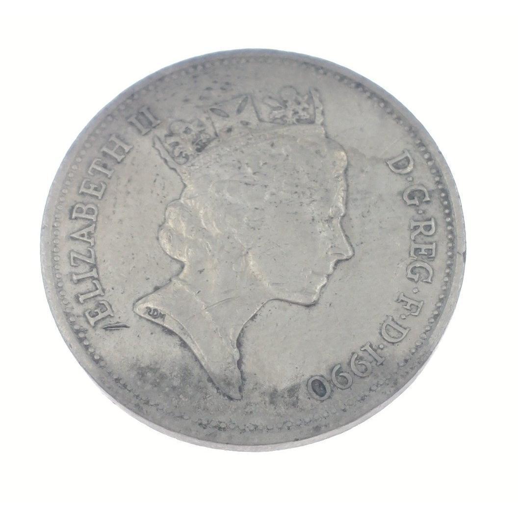 A silvered 1990 UNITED KINGDOM 2 Pence coin. With light wear and patina. Unusual piece for the enthusiast.