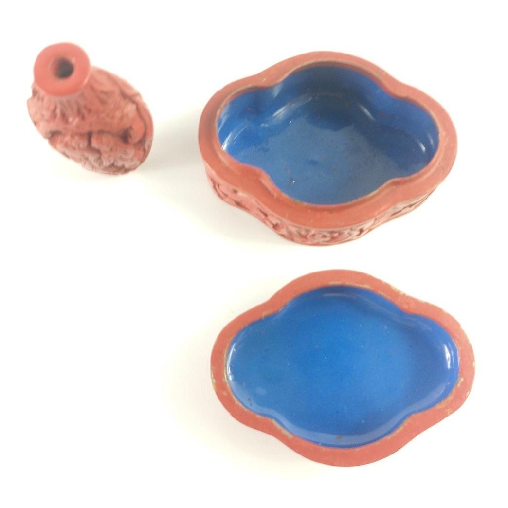 A red coloured snuff bottle (6cm) with carvings of Oriental gentlemen, minus stopper, and a small trinket box with blue enamelled interior (7cm W x 4cm H)Approx 2 pieces