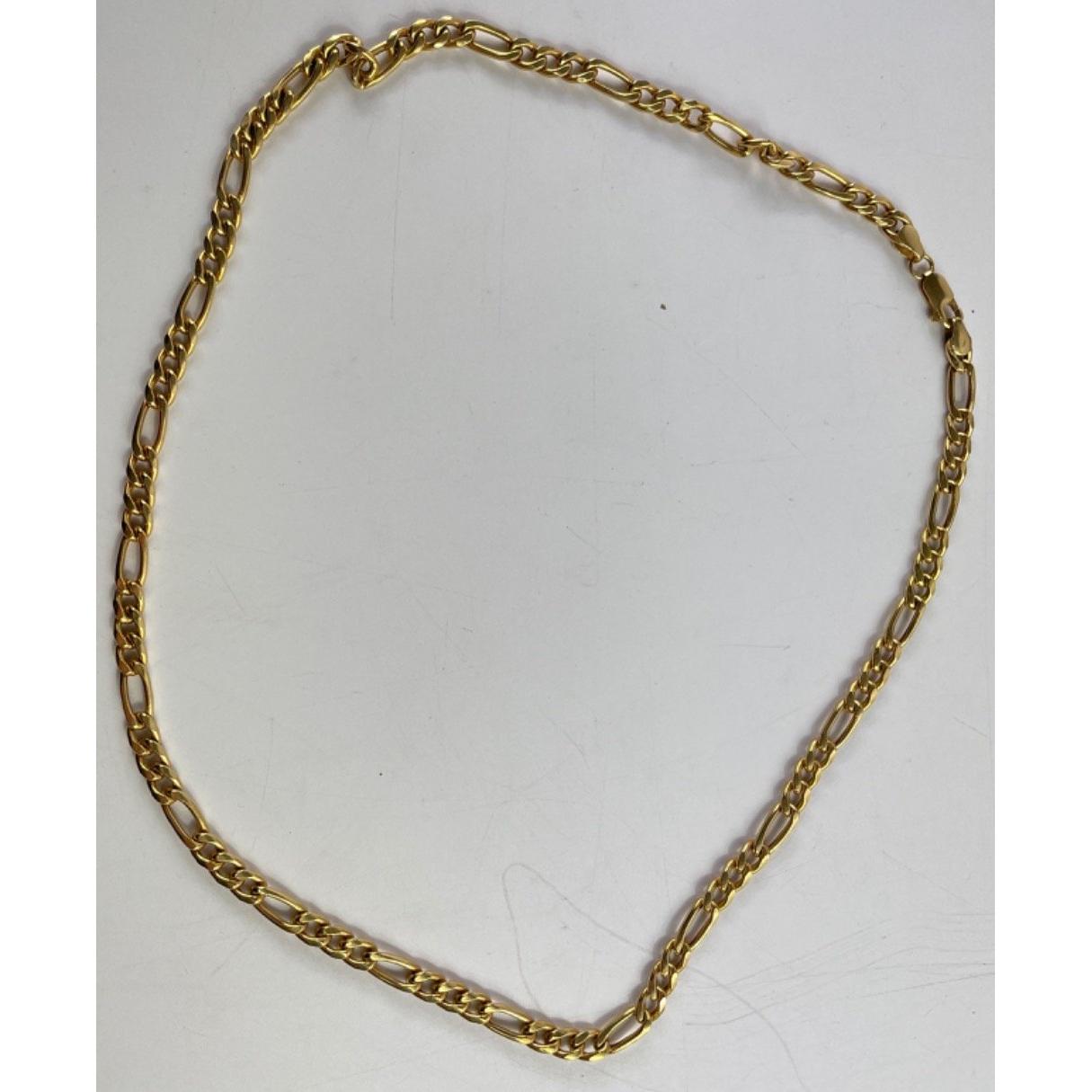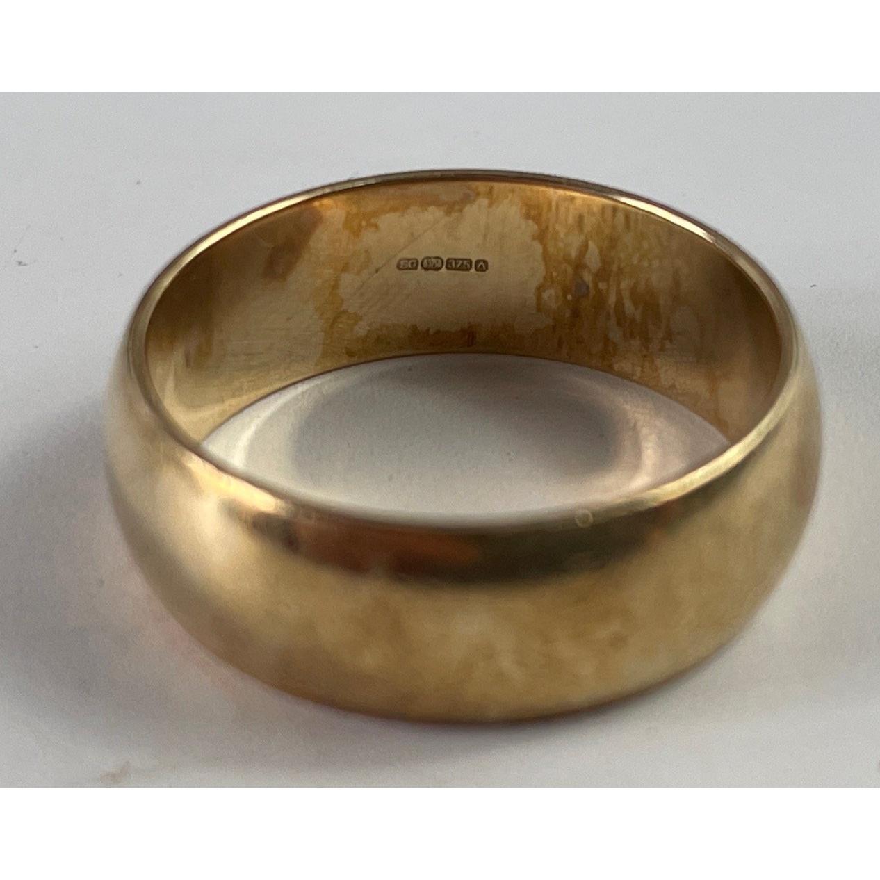 A yellow metal ring, size R/S, and chain 51cm long, both stamped 375, weight 16.83g plus a yellow metal half coin pendant 2cm long (2.2g)Approx 3 pieces