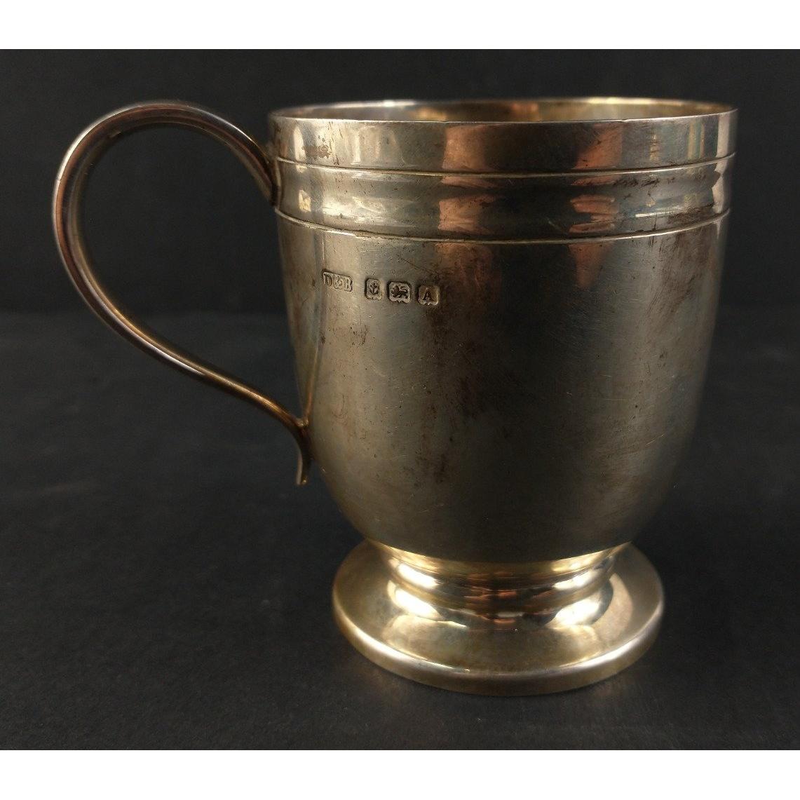 A pretty 8cm high uninscribed christening type cup. Carries full hallmarks for Birmingham 1925 with a D&B maker’s mark. Gross weight 136g approx.