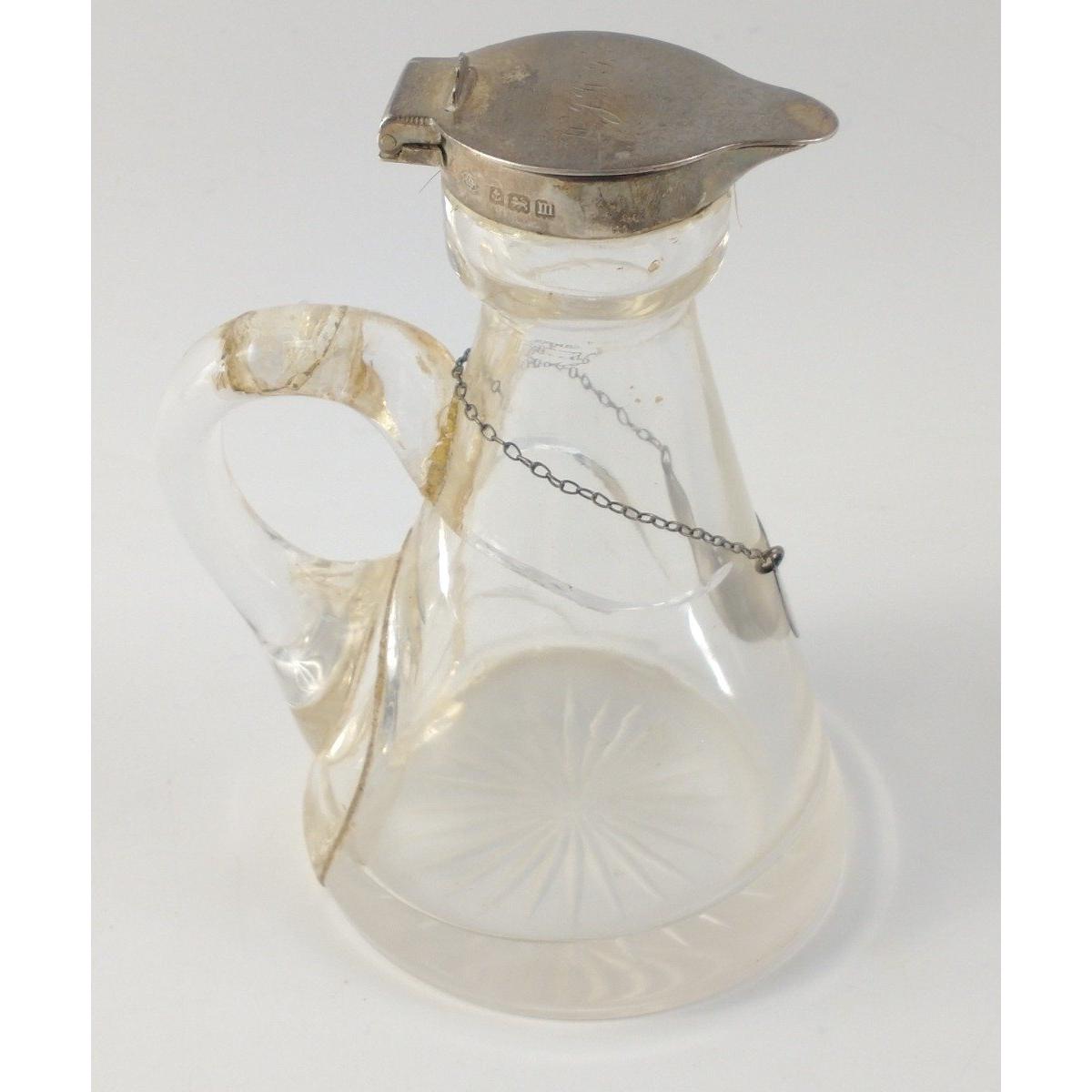 A small antique vinegar bottle in poor damaged / repaired condition but with a nice hallmarked silver top and a small silver WHISKY collar with full London hallmarks for 1911. Stands 10cm high approx.