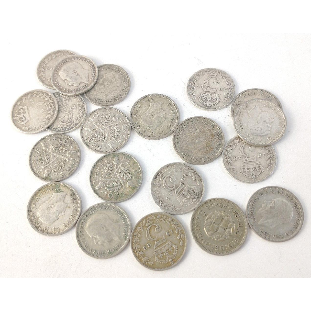 A small screw top tin bottle containing 20 pre-1947 three pence coins. Total gross weight 27.7g approx. A few older but most 0.500 silver content.