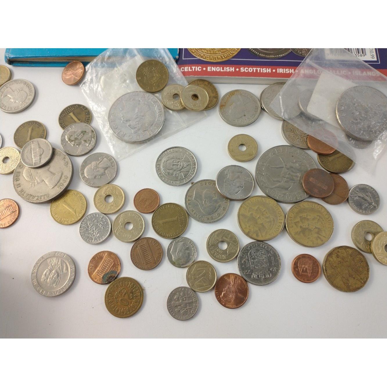 An interesting lot of coins and banknotes including collectible £5 and £2 coins with some American coins and other overseas coinage. Include two handy coin guide books.