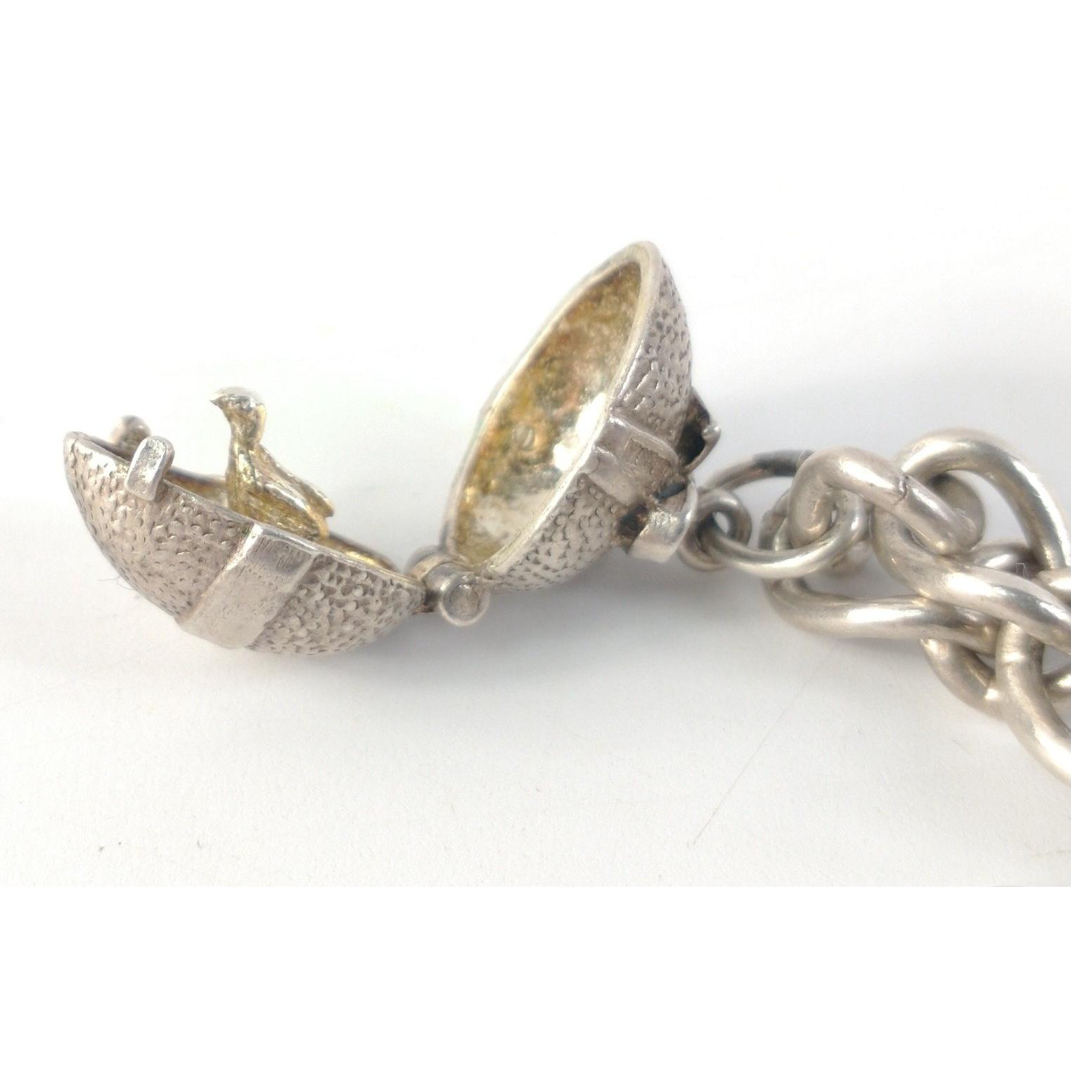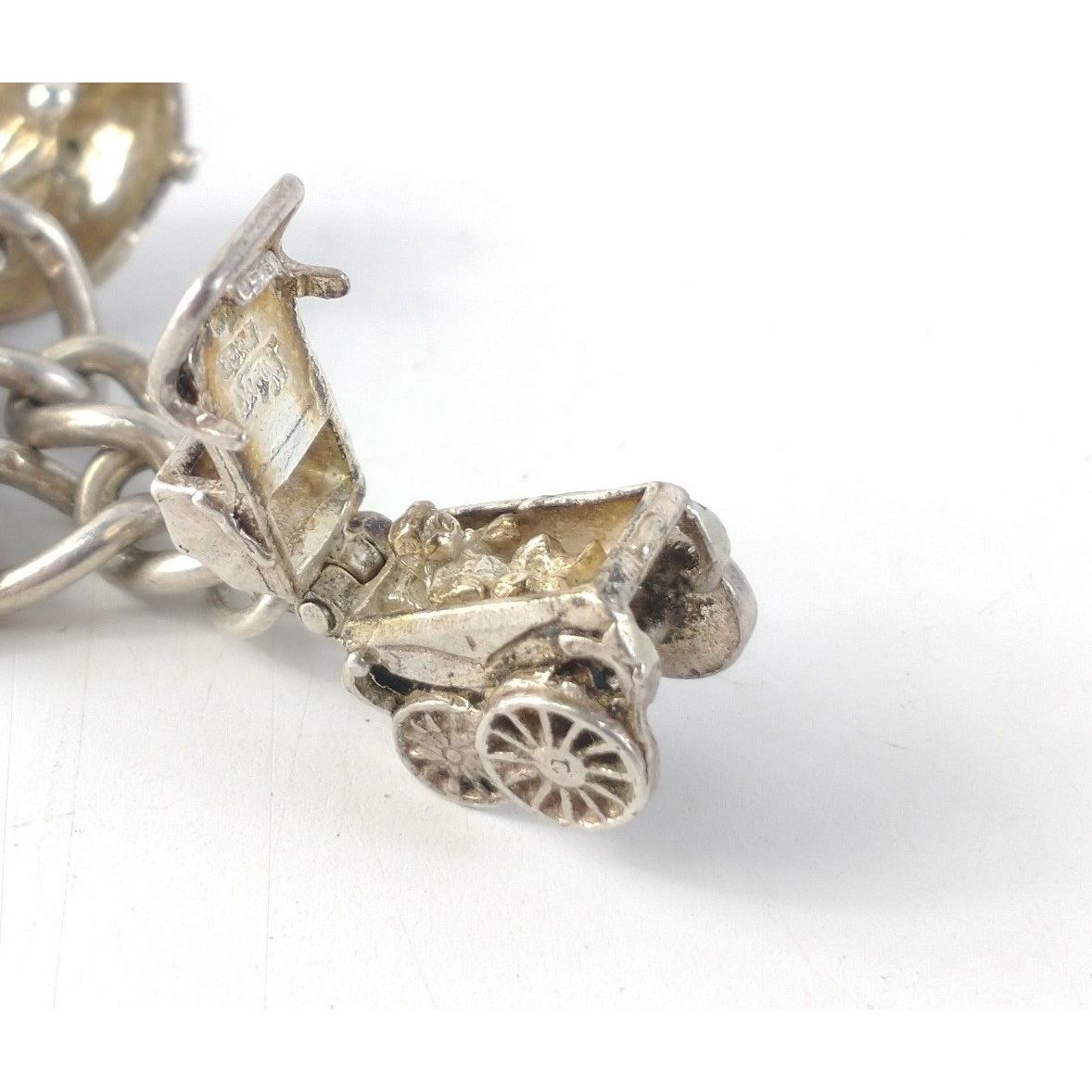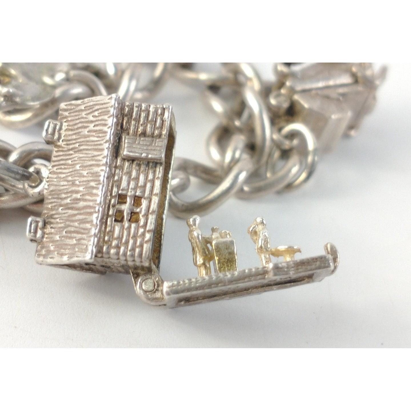 A lovely little sterling silver charm bracelet with some articulated charms. Chain linked are individually stamped. Charms include rocking horse, opening egg with bird inside, a lock, a pram with baby, an oil lamp and a pub with drinkers inside. A lovely little thing. Total gross weight 31.3g