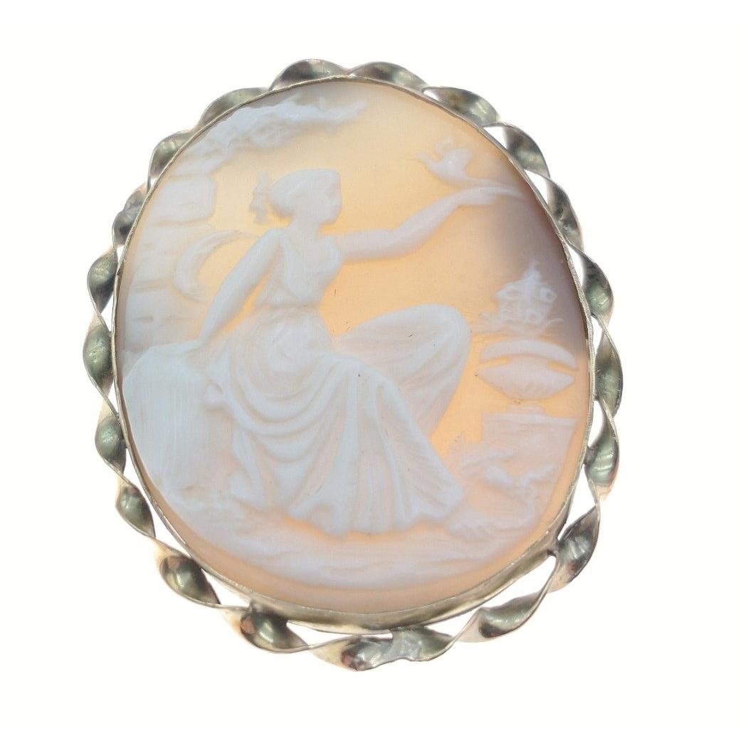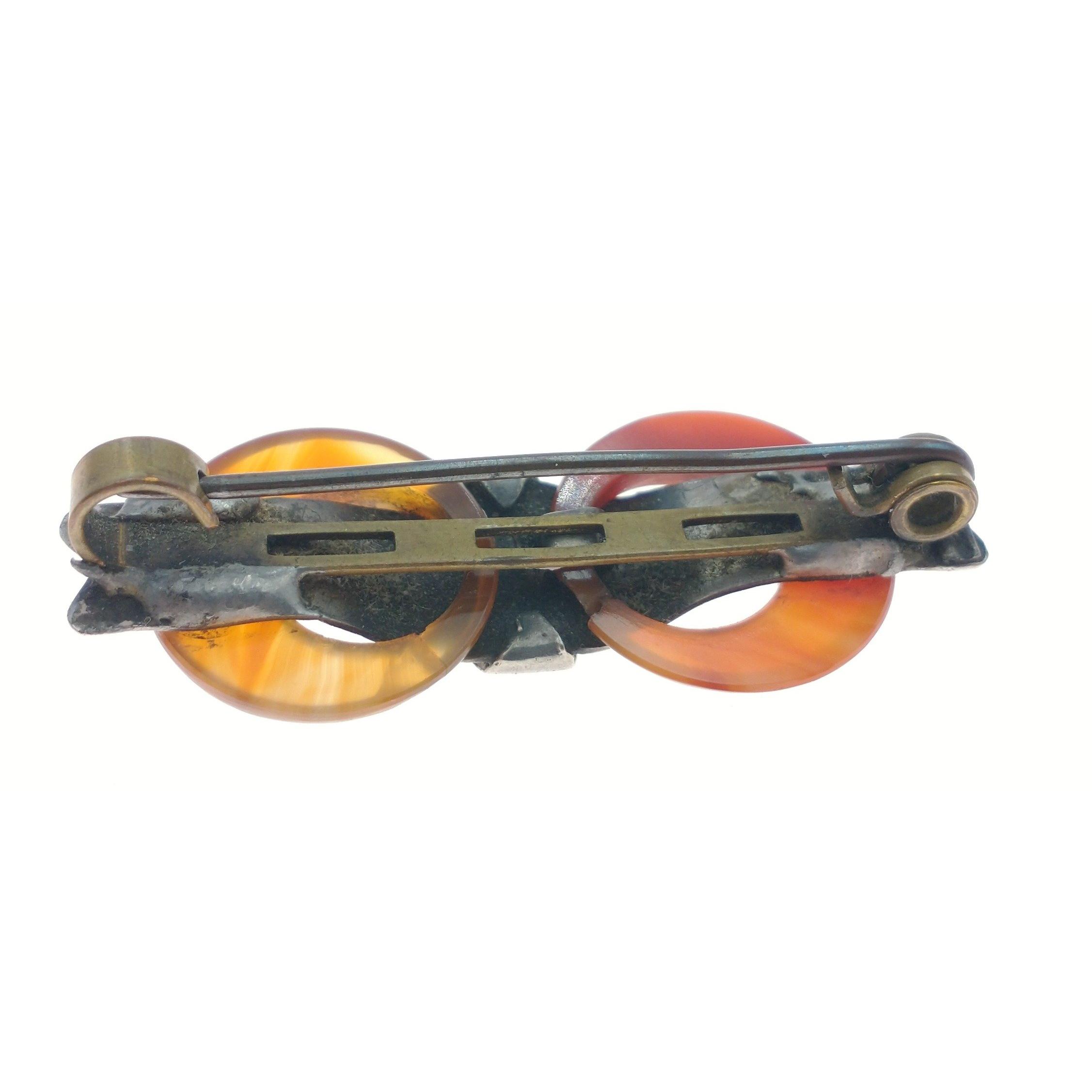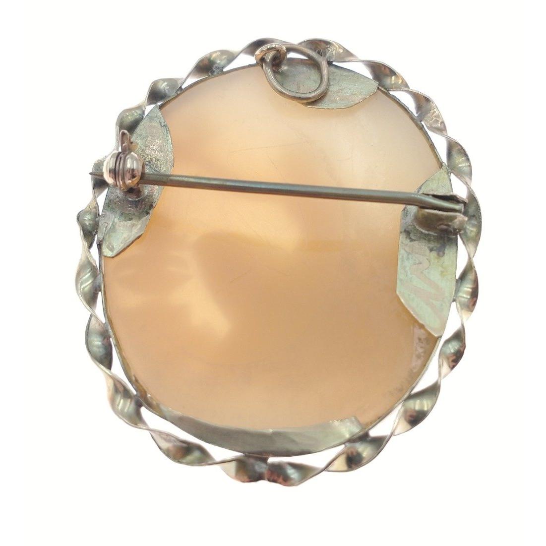 VINTAGE - A small box with 2 brooches one is a yellow metal cameo (4.75x4cm) the other is a white metal buckle style brooch with circular amber style endsApprox 2 pieces