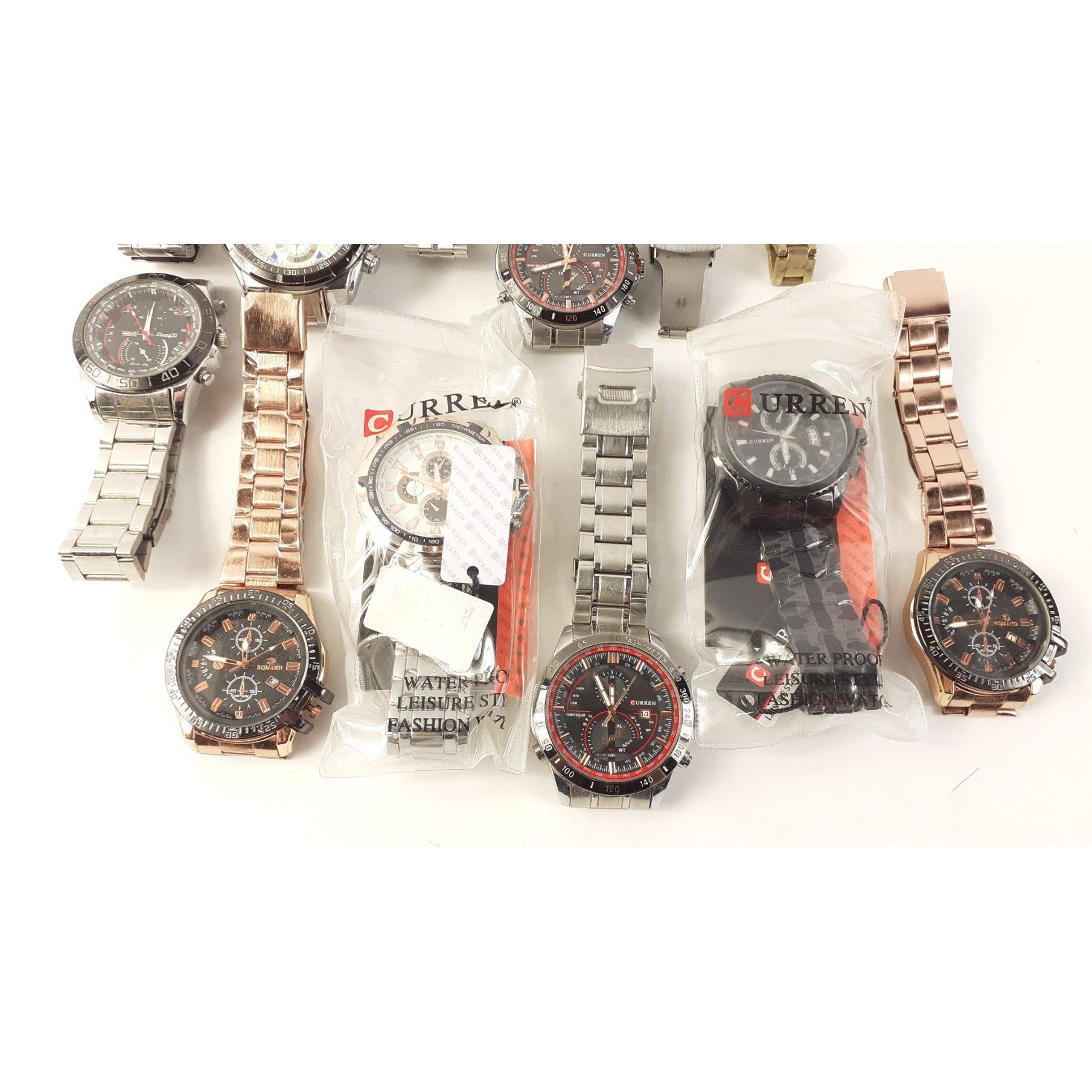 A box of gent's fashion watches to include by CURREN (6), ZHONG YI (1), RQMAND (2), LONGBO (2), and 1 limited edition used ladies watch 'Hope'