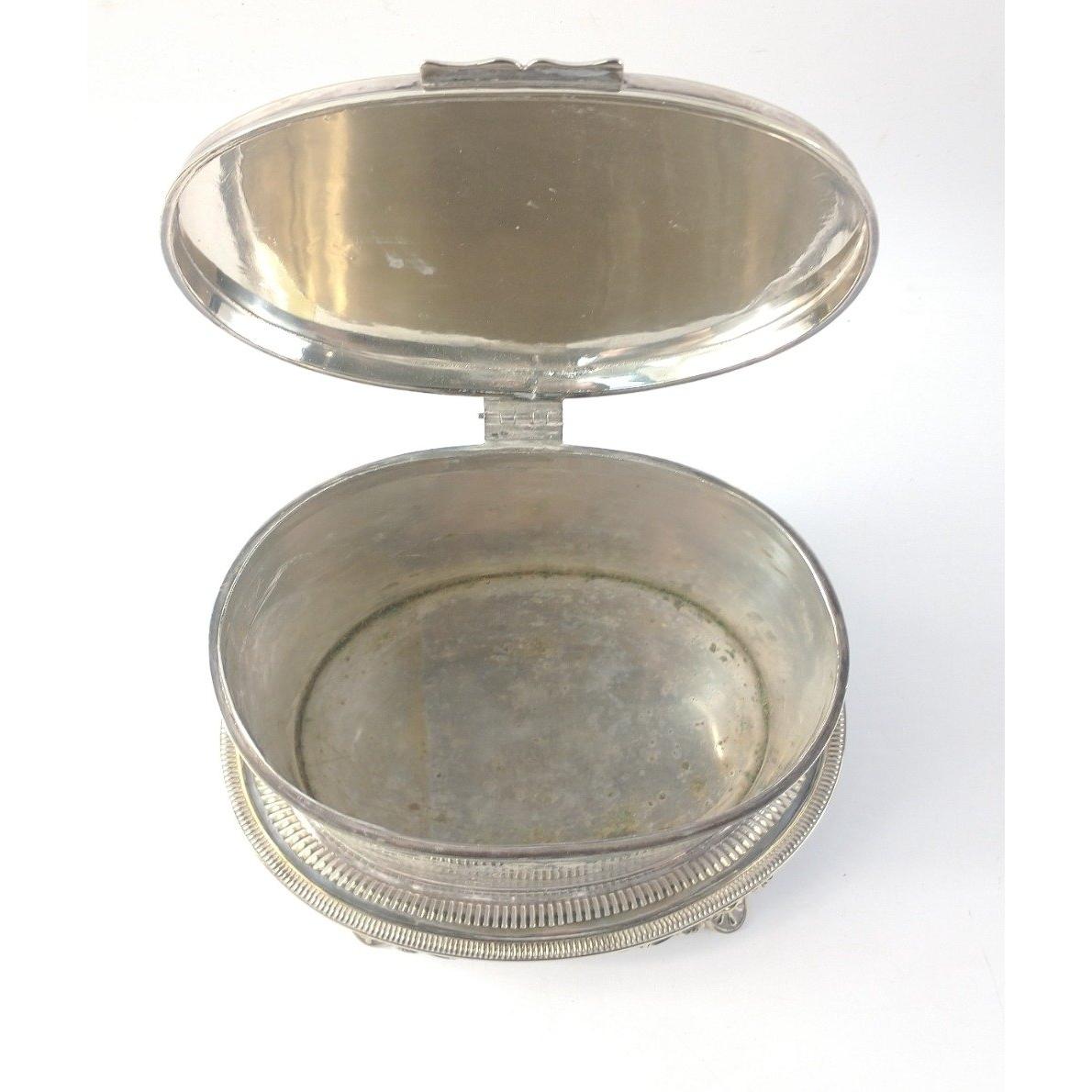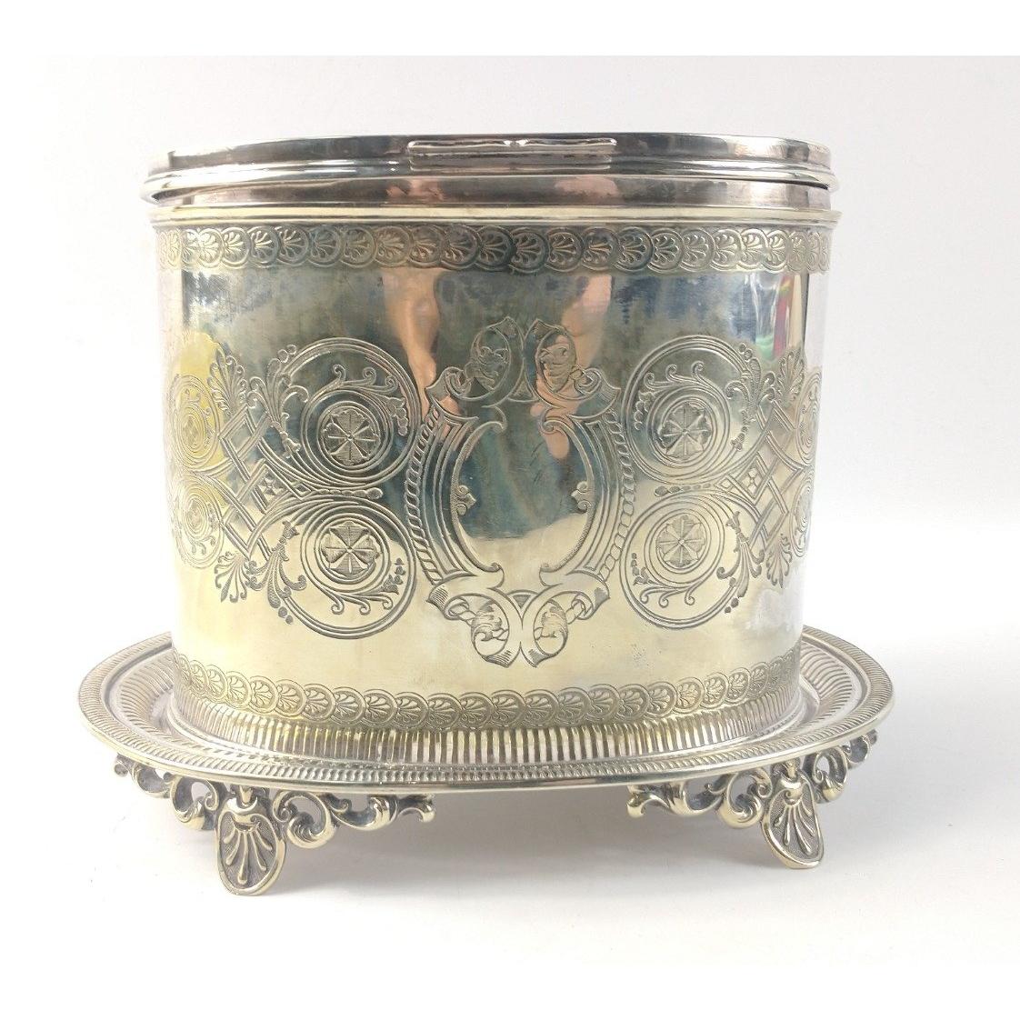 A versatile oval white metal lidded box - tea caddy, tobacco jar or biscuit barrel, on its own base, stands 17cm high, base approx 24cm Approx 1 pieces