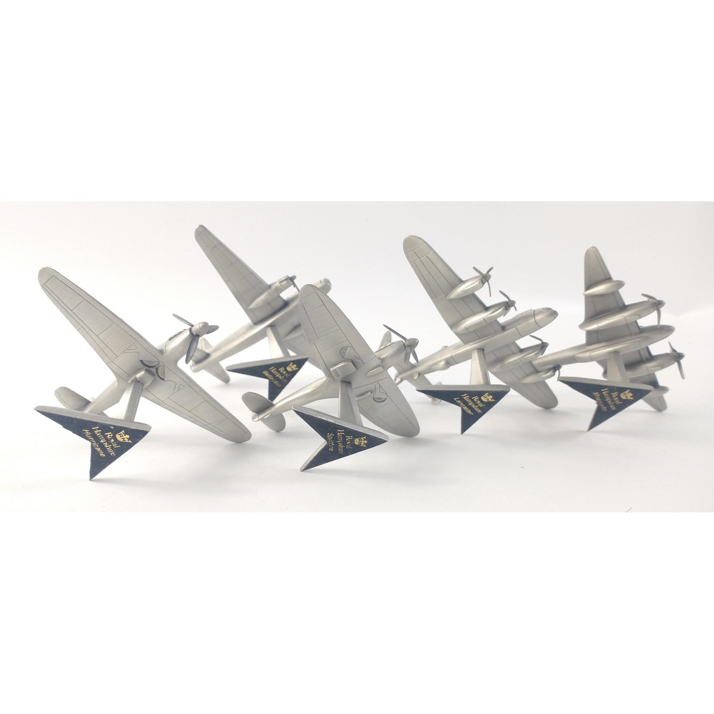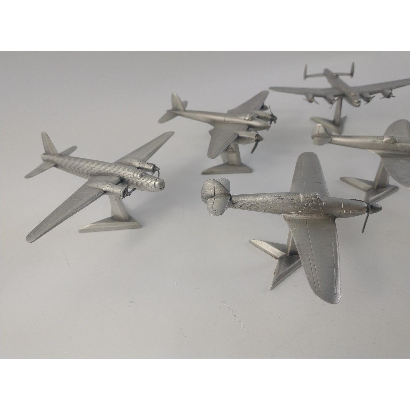 From ROYAL HAMPSHIRE, a collection of 5 aluminium propeller driven aircraft to include a Hurricane, Lancaster, Mosquito, Spitfire, and Wellington. Some propellers need to be straightened but otherwise very good condition.