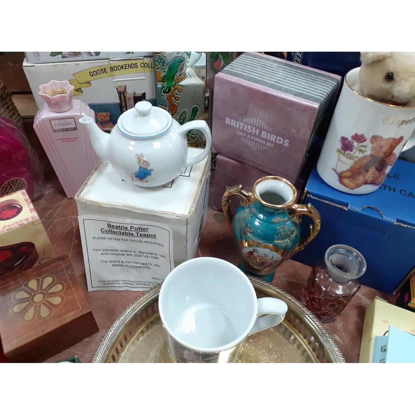 An assorted lot of bric a brac to include H Samuel silver plated dressing table set in box, leather Teddy Bear money boxes, Minster Giftware, Portmeirion mug set, assorted jewellery and trinket boxes, tablewear, a very cute little Teddy in a mug by Berkshire and lots more beside. A great lot.