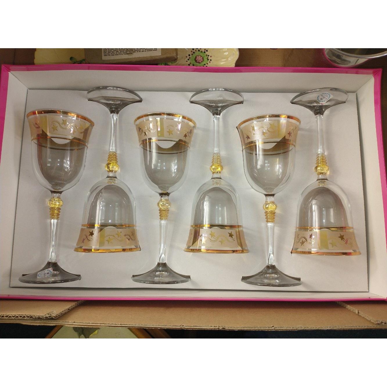 A mixed box to include an ice bucket with stag head handles (19cm high approx), a box of 6 GA cristal wine glasses with gilt rims, 2 trinket dishes, etc