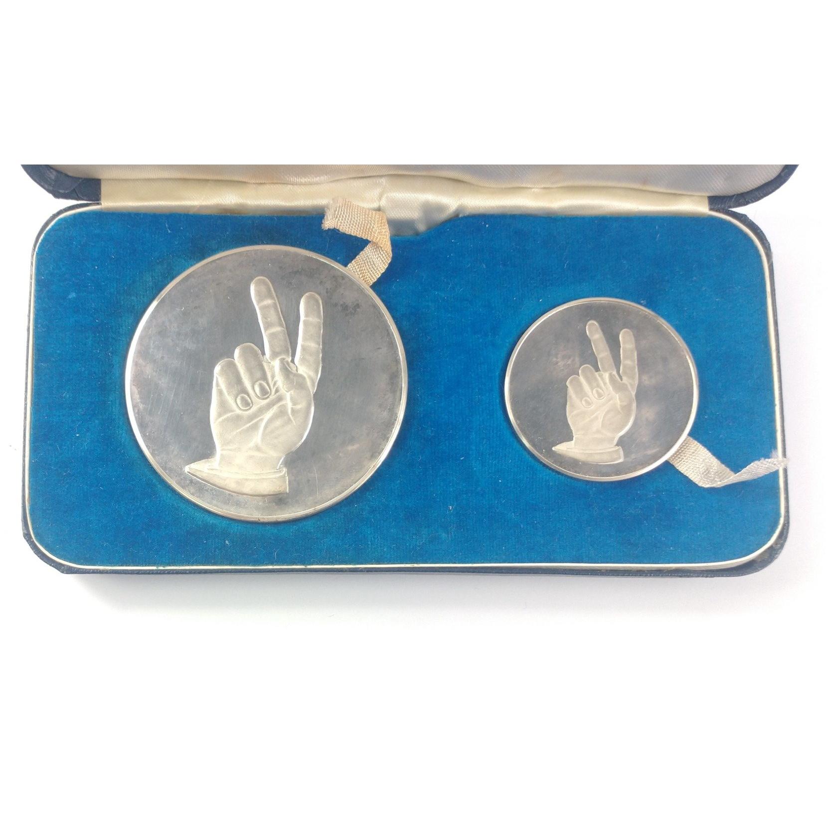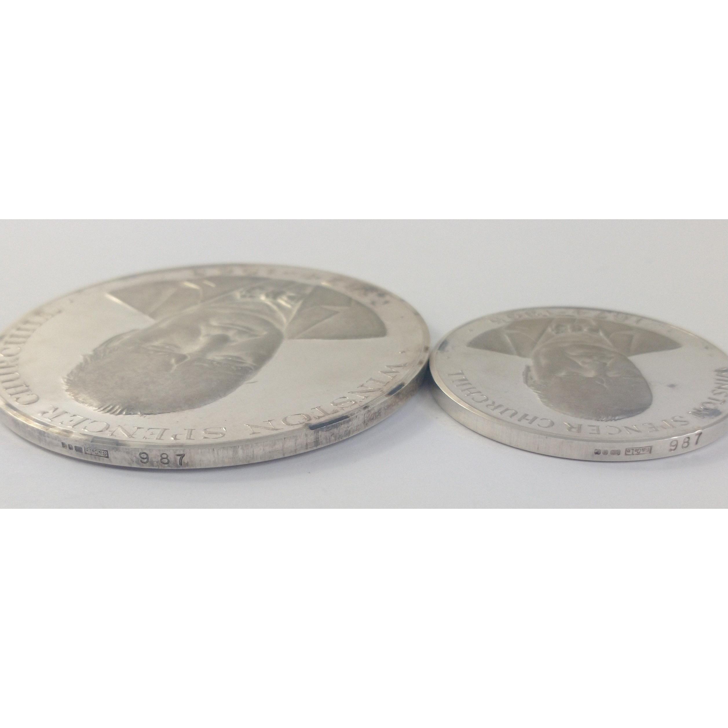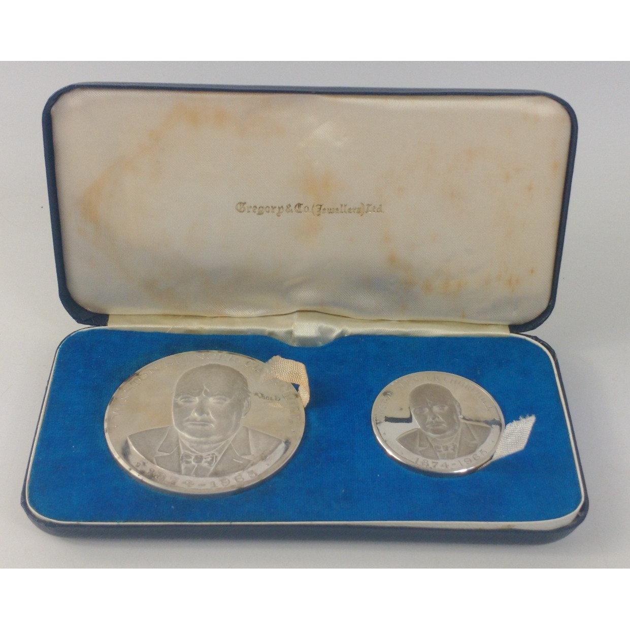 A superb cased Solid silver coin set commemorating the life of SIR WINSTON CHURCHILL. Both coins fully hall marked to rim with matching 987 Limited Edition numbers. The large coin weighs 78.9g and the smaller 27.6g. Produced by Gregory & Co. in a Limited Run of 1000 pieces this is a very impressive set.