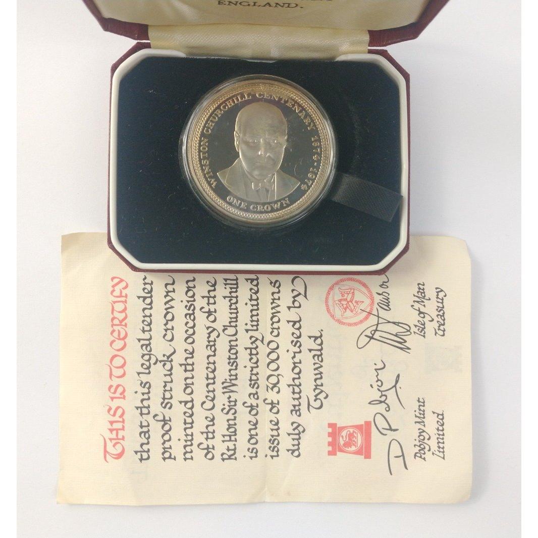 Pobjoy Mint Isle of Man WINSTON CHURCHILL Centenary commemorative coin limited to 30,000 in case with Certificate of Authenticity. The crown is encapsulated