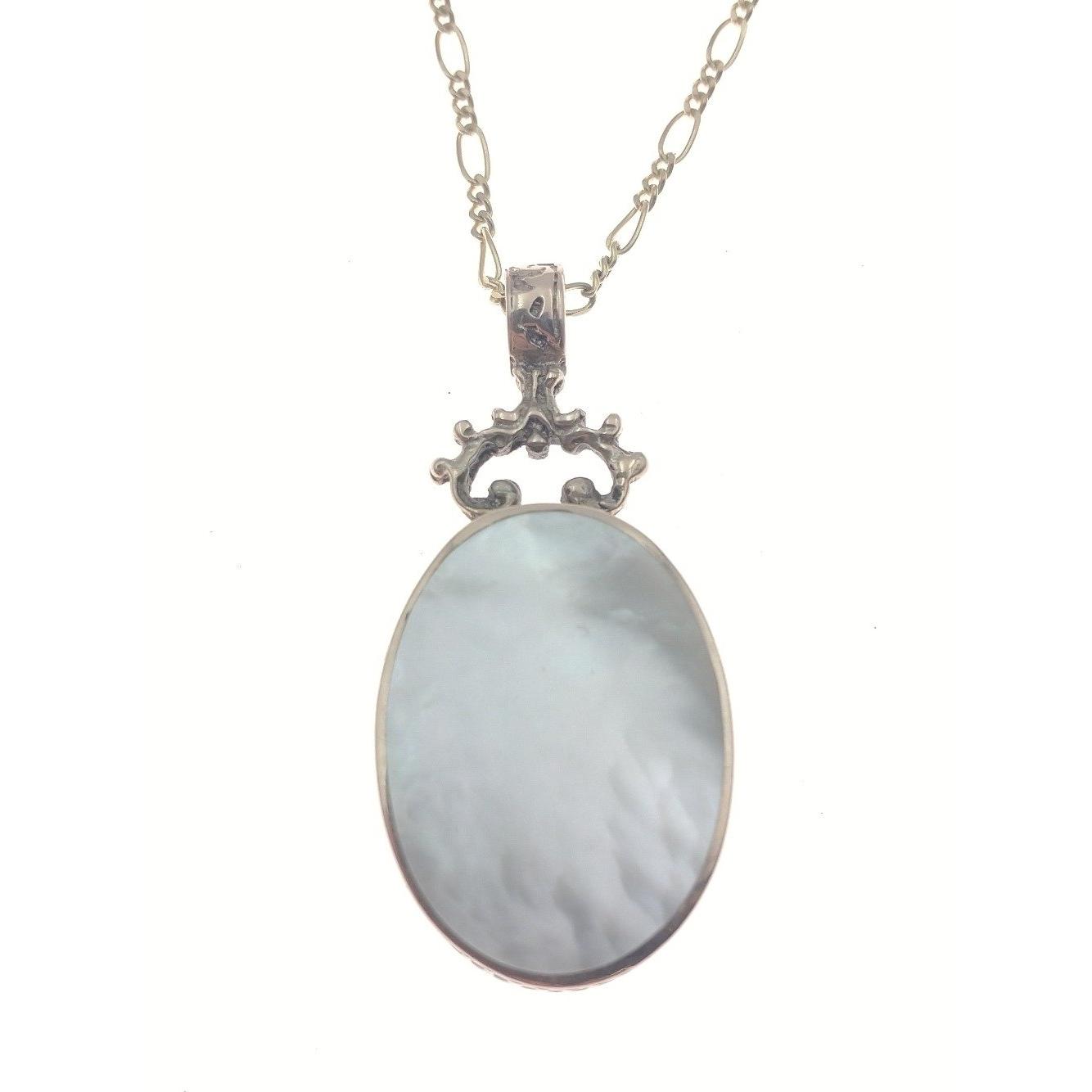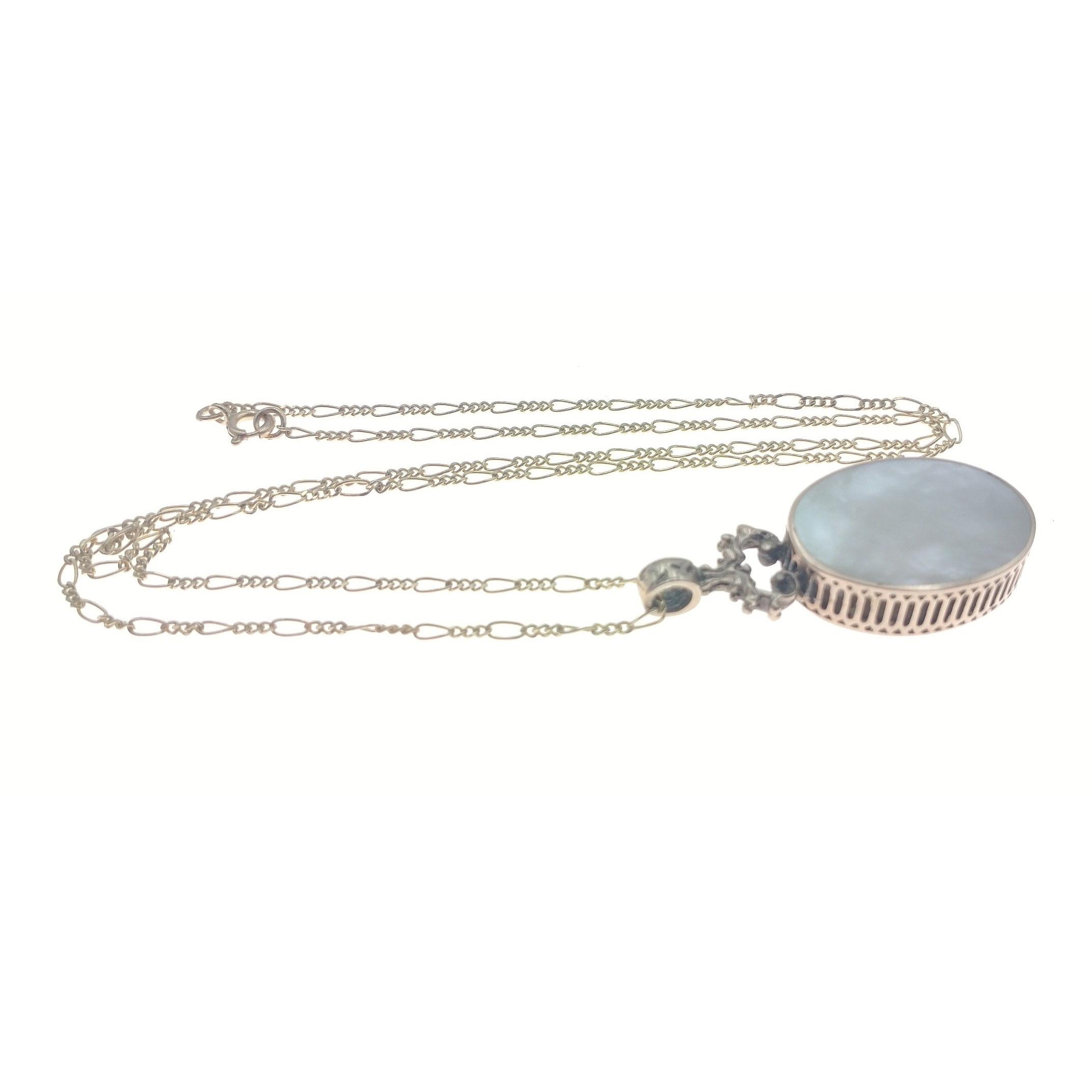 A double-sided mother of pearl and silver hallmarked pendant (3cm long) on a 375 stamped chain (54cm long approx, 3.1g approx), gross weight 11.5g approxApprox 1 pieces