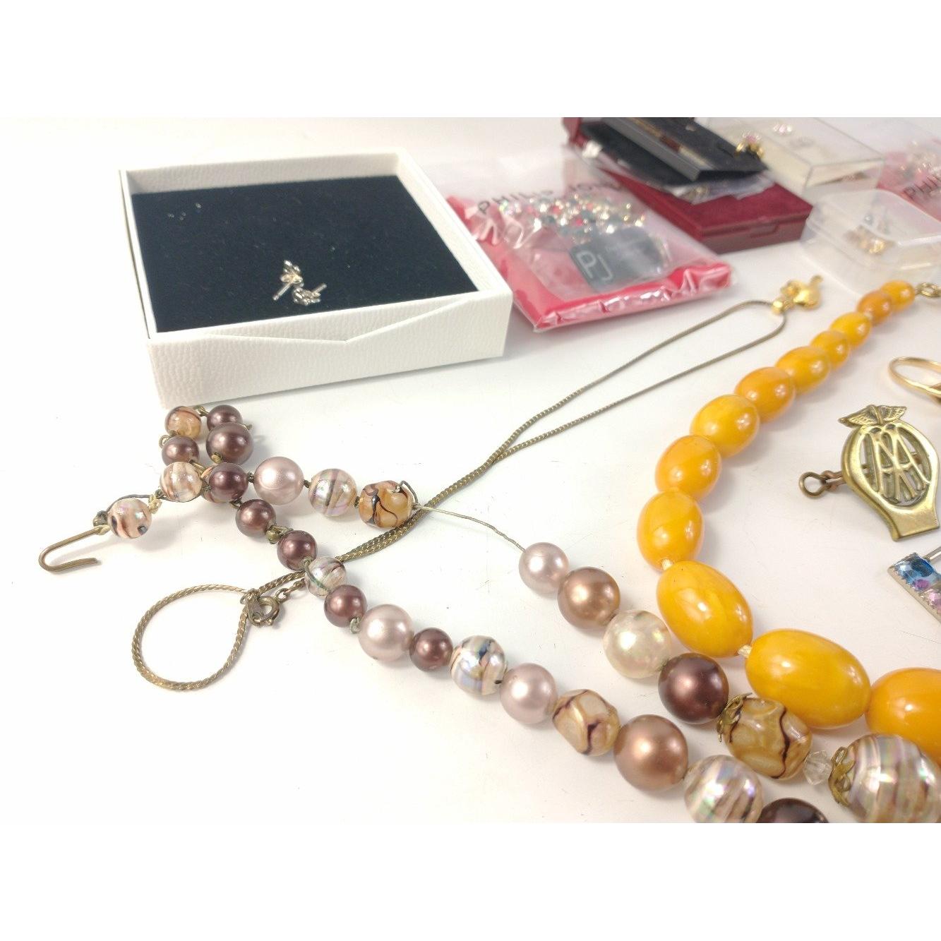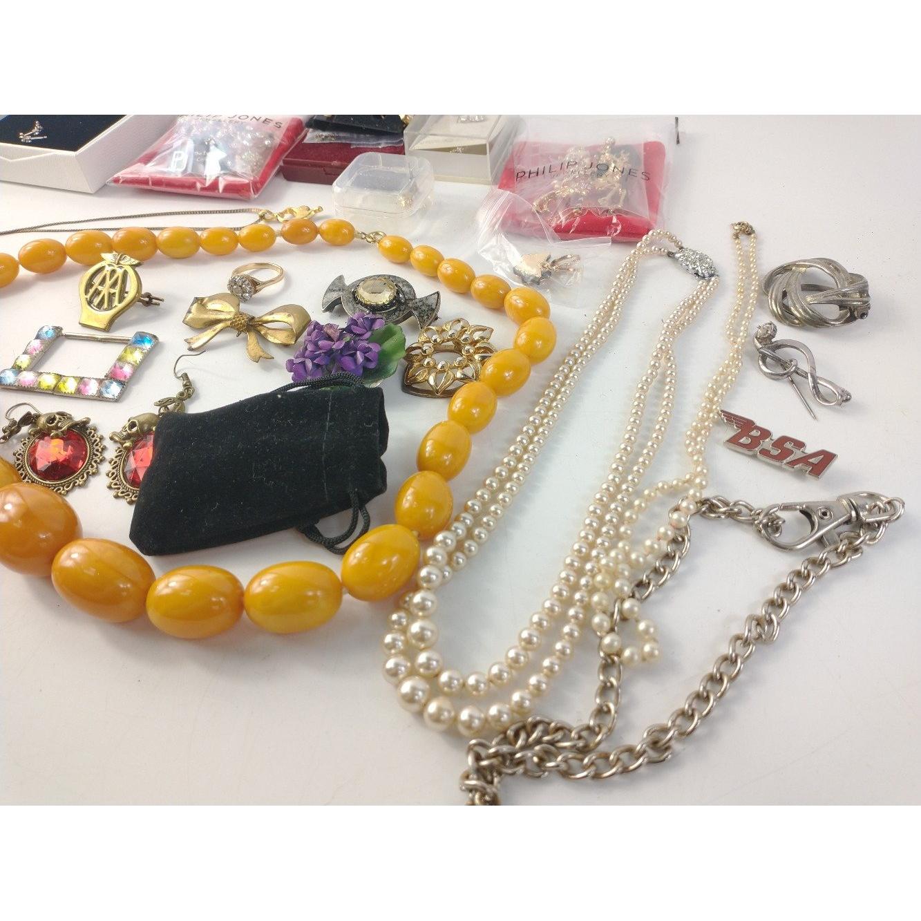 A mixed bag of costume jewellery to include Philip Jones, beads, earrings etc