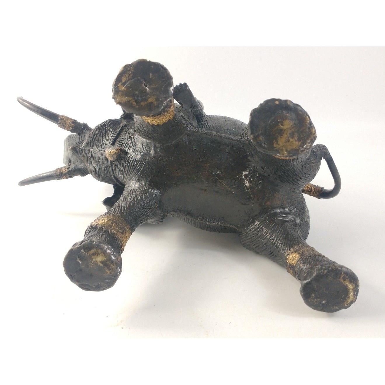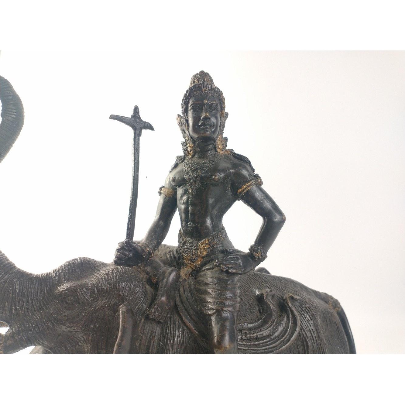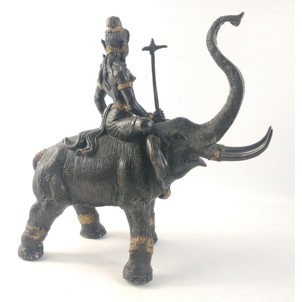 A heavy bronze effect statue with beautiful patina of the Tamil protective God Ayyanar riding an elephant. Approx. L30cm x W15cm x H30cm. An extremely well scupted substantial model. Approx 1 pieces