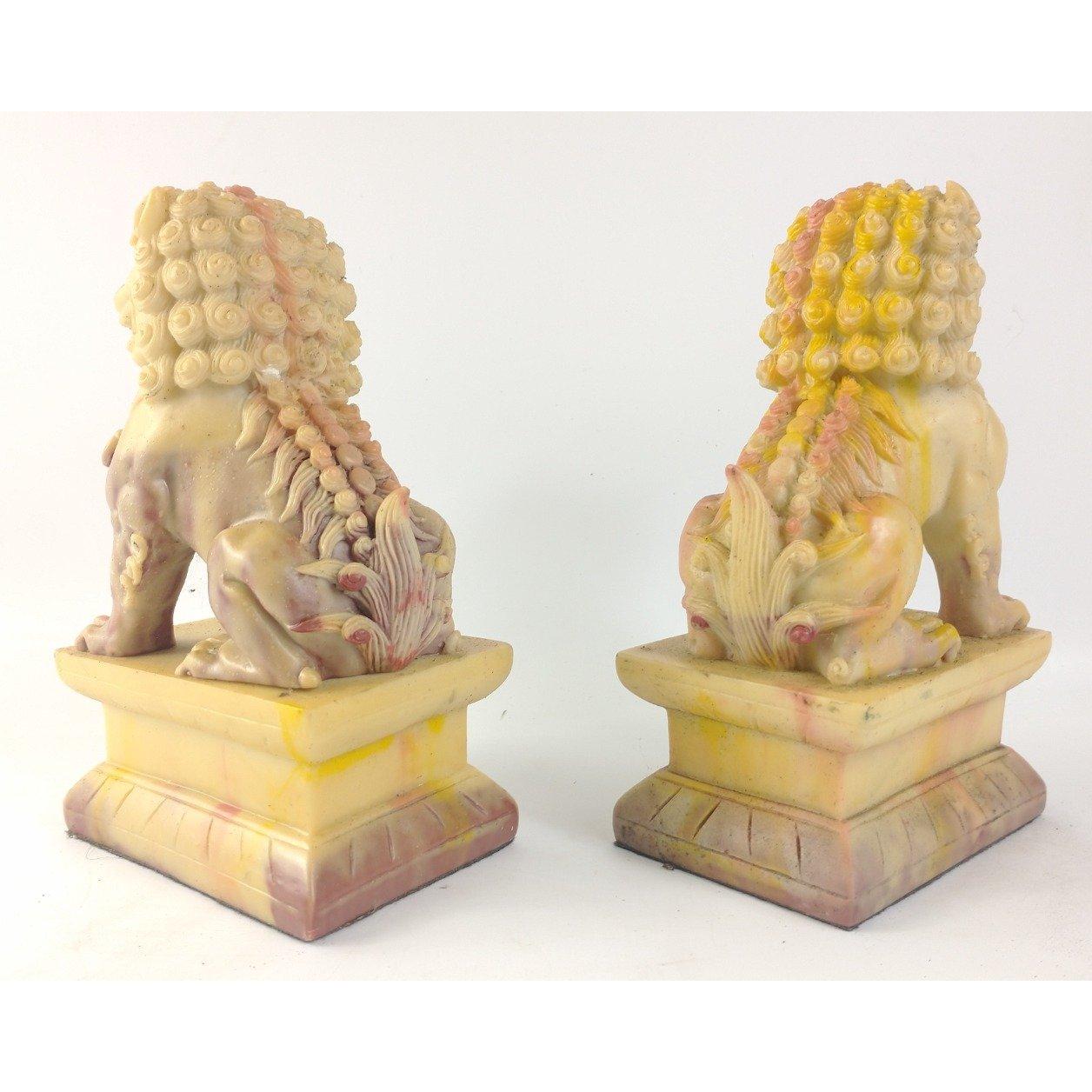 A pair of ochre/red coloured resin oriental Foo dogs approx. L10cm xW7cm x H17cm.Approx 2 pieces