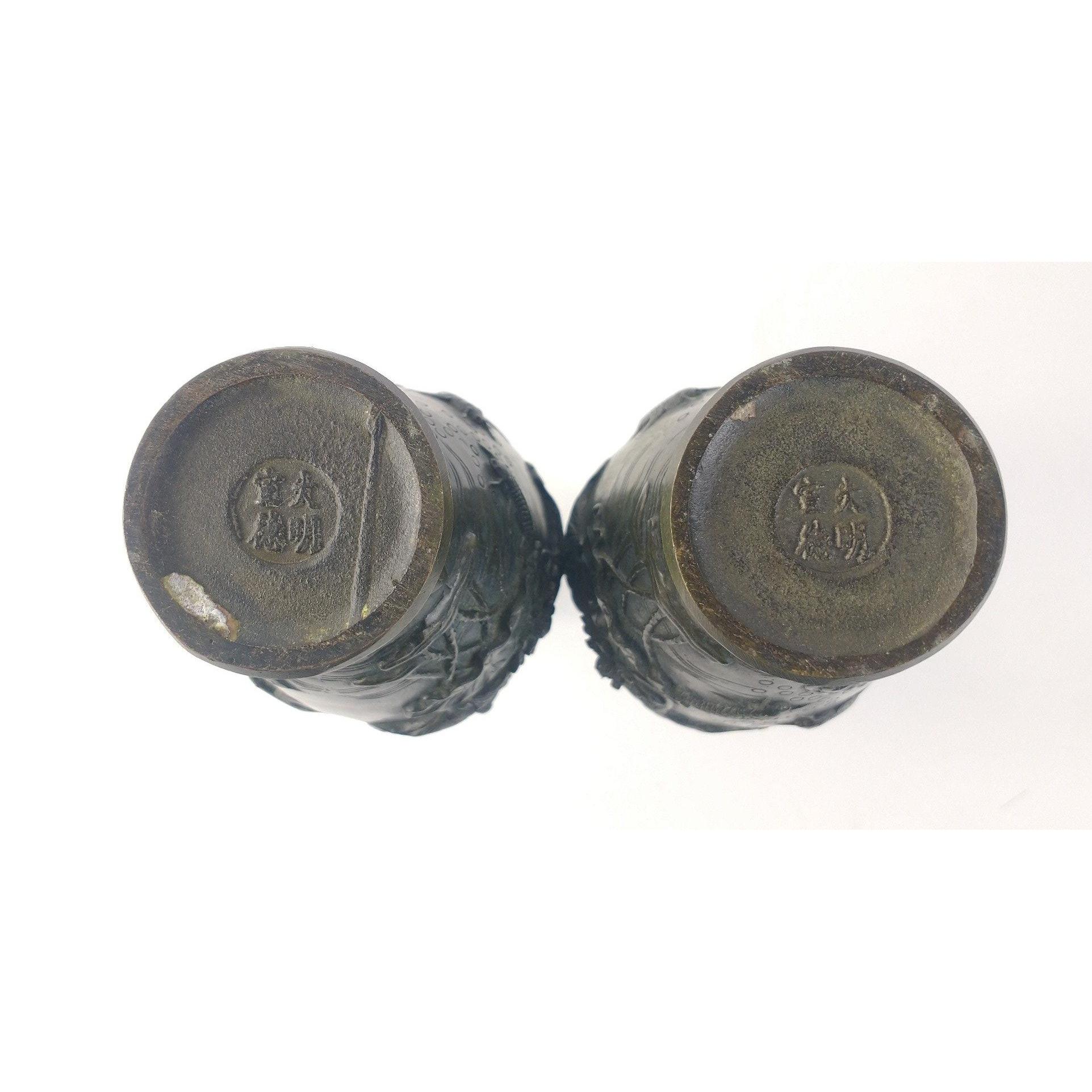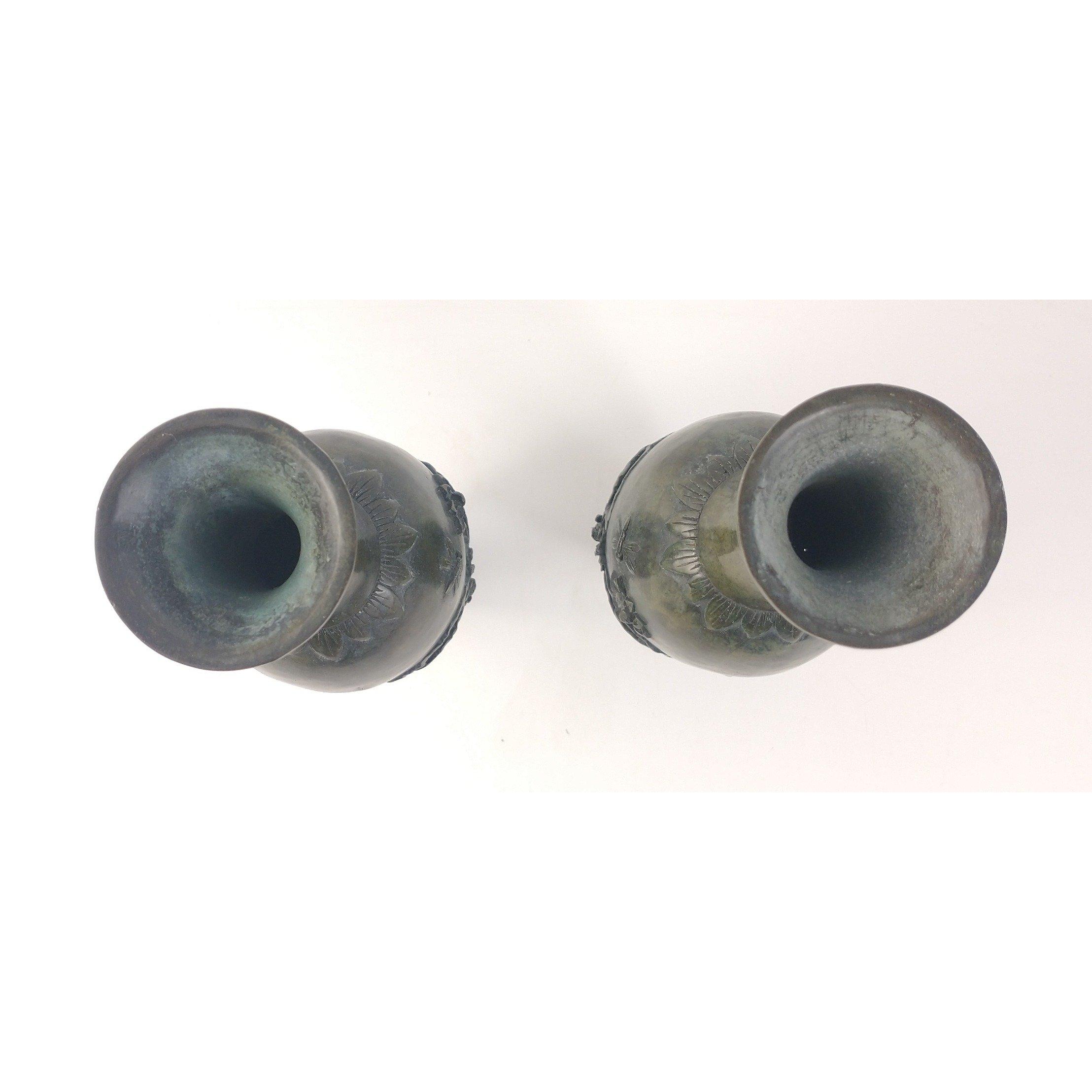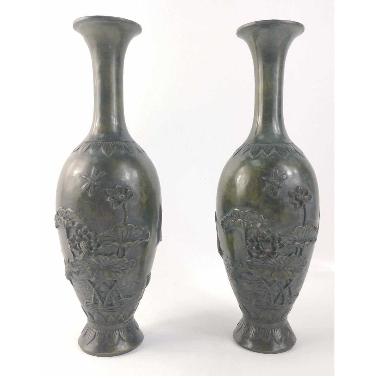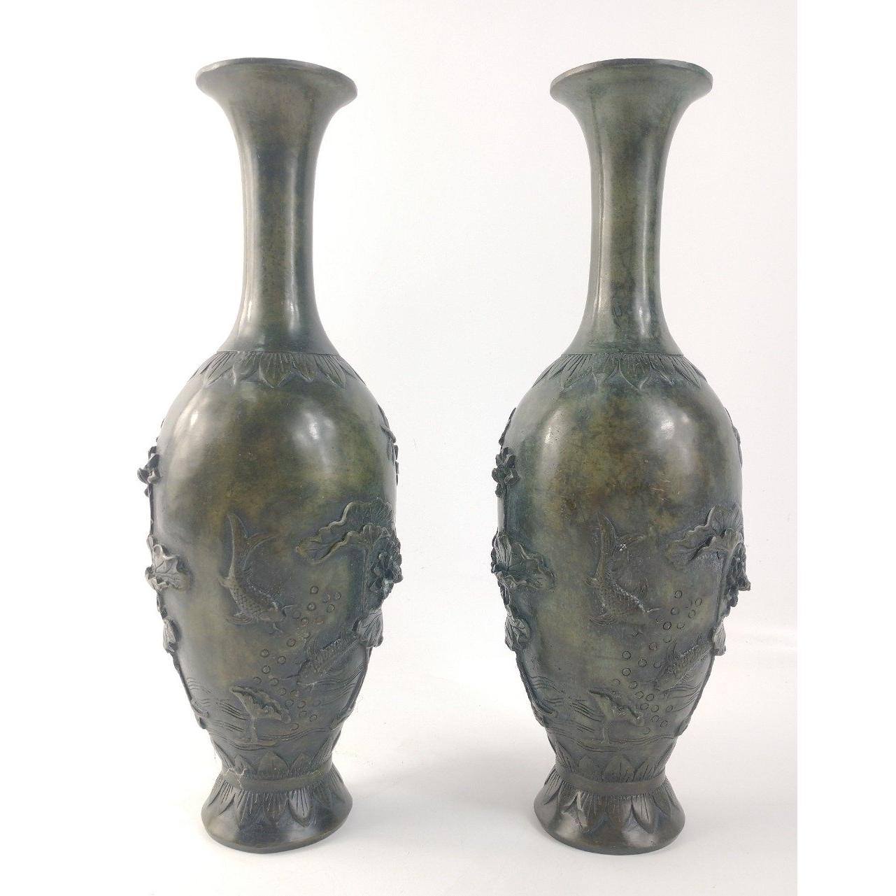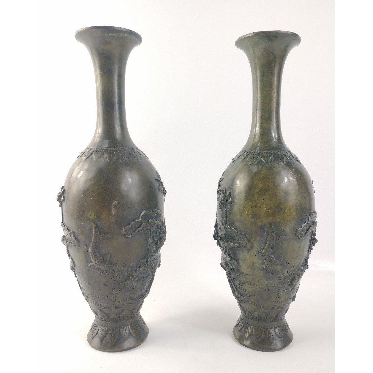 A pair of elegant (possibly spelter) oriental vases with lovely green patina and delightful water lily, fish, water and dragonfly motifs. Approx. 9cm in diameter and 25cm tall.Approx 2 pieces