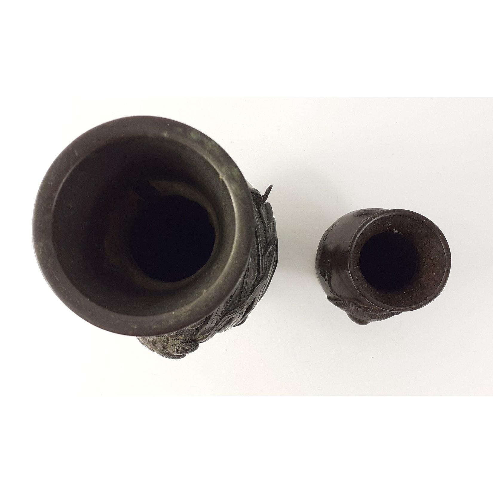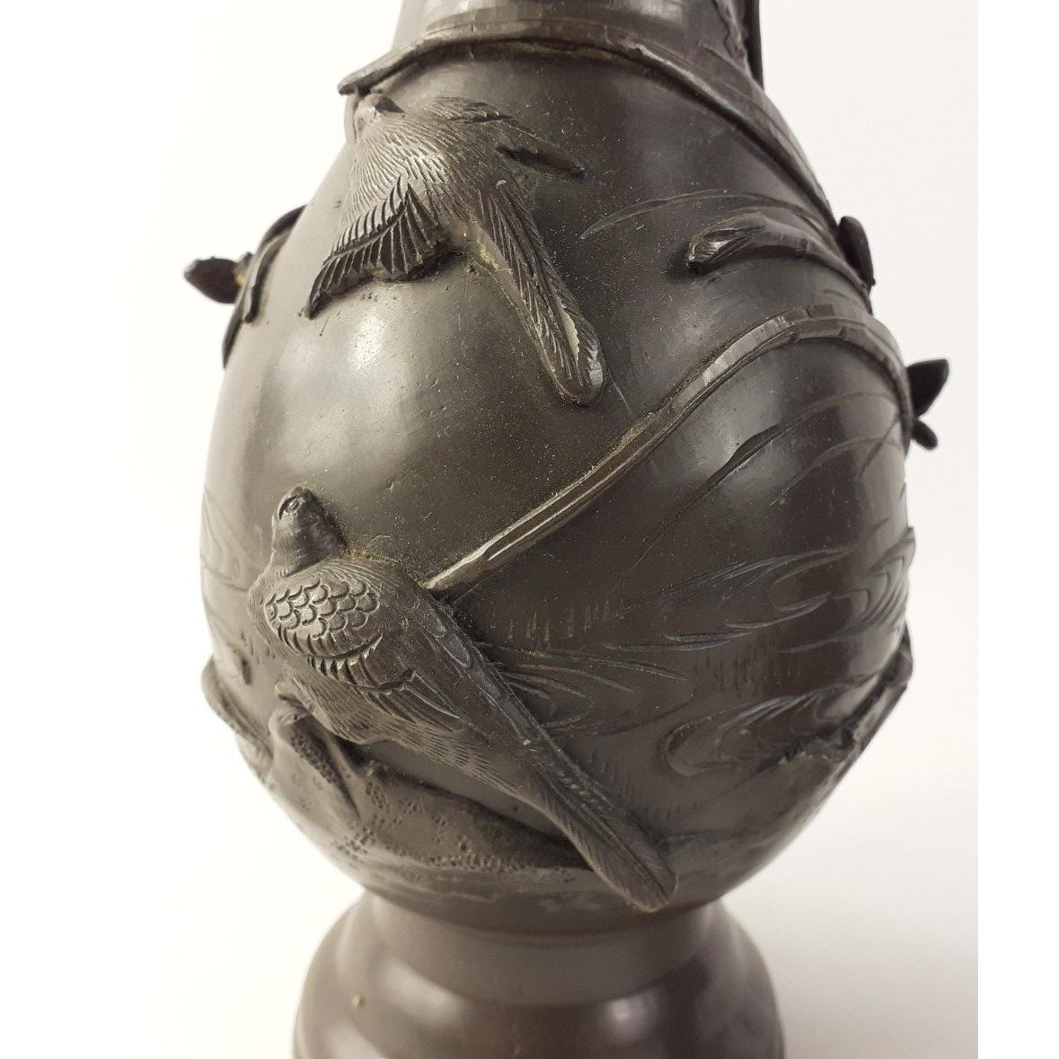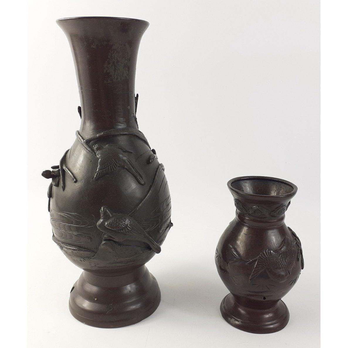 Two oriental style bronzed vases with bird decoration taller 25cm, smaller 12cm tall approx.Approx 2 pieces