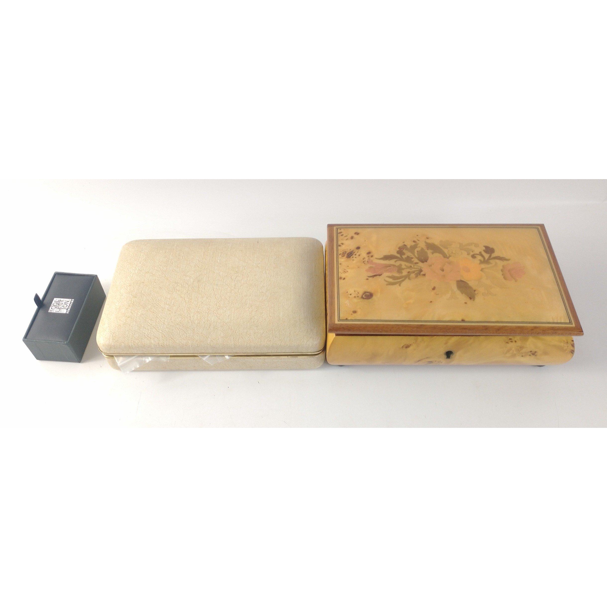 Two jewellery boxes, one a music box, stuffed full of cufflinks