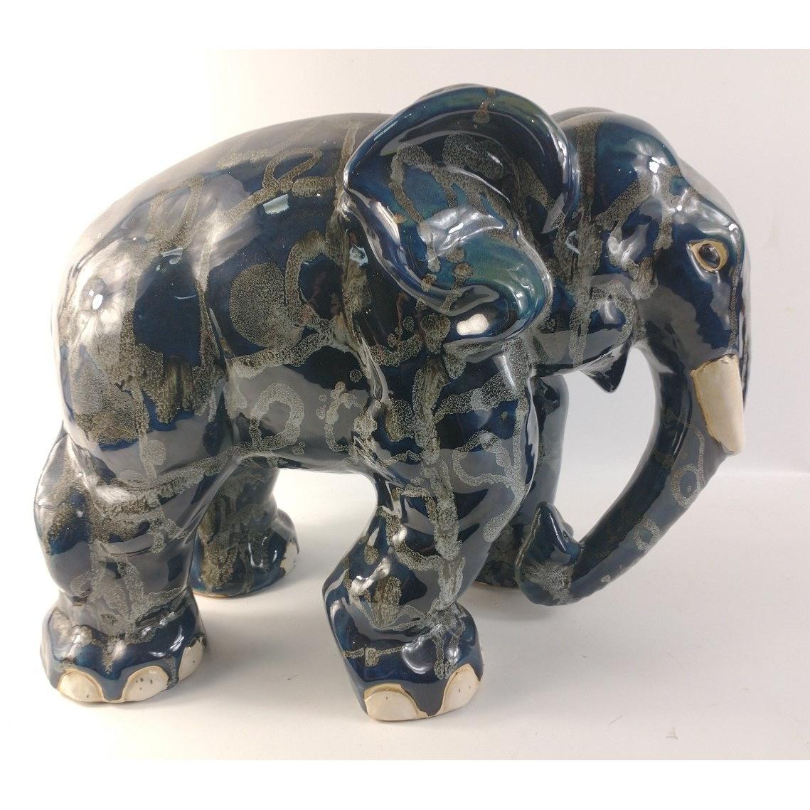 An unusually attractive pair of ceramic elephants glazed in colours of blue/grey/black with random grey textured patterning. Approx. L50cm x W28cm x H37cm.Approx 2 pieces