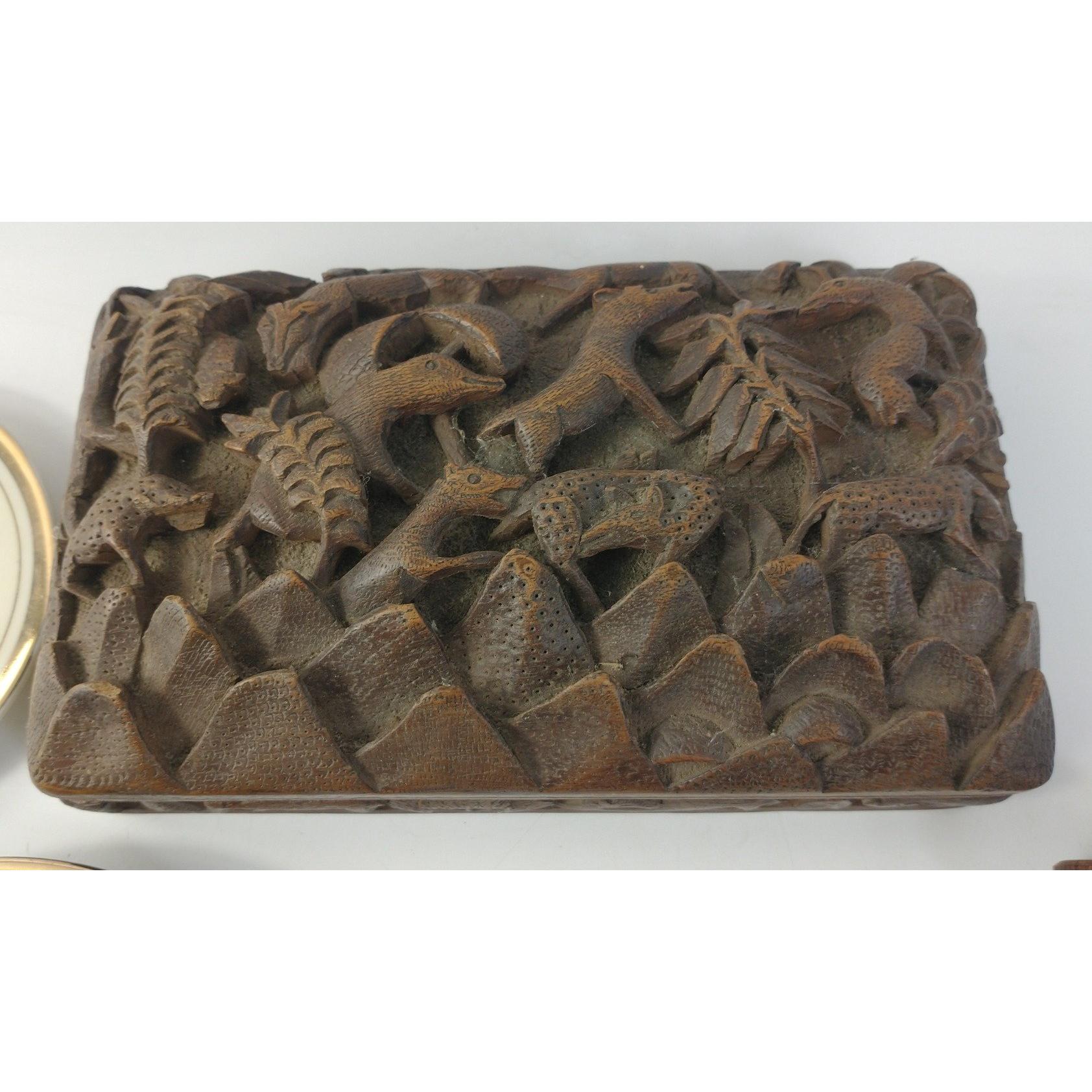 A collection of decorative items to include one wooden gavel hammer approx. L17cm, an intricately carved Asian wooden box with two compartments approx. L20cm x W12cm x H6cm, a 24K gold-edged black Japanese Chokin plate approx. 16cm diameter, a 24K gold-edged cream Japanese Chokin plate approx. 11cm diameter, and a round compact mirror with image of Mary Queen of Scots on back approx. 8cm diameter.
