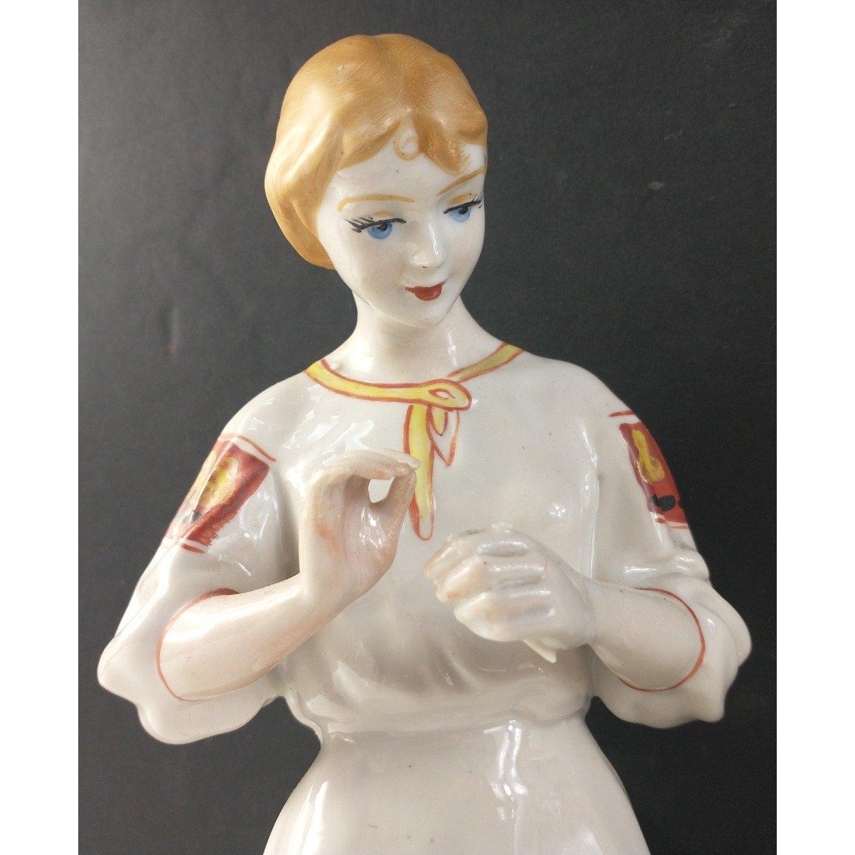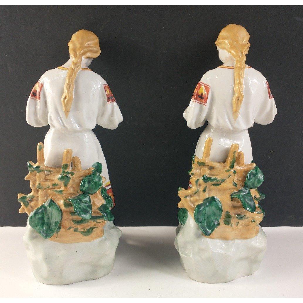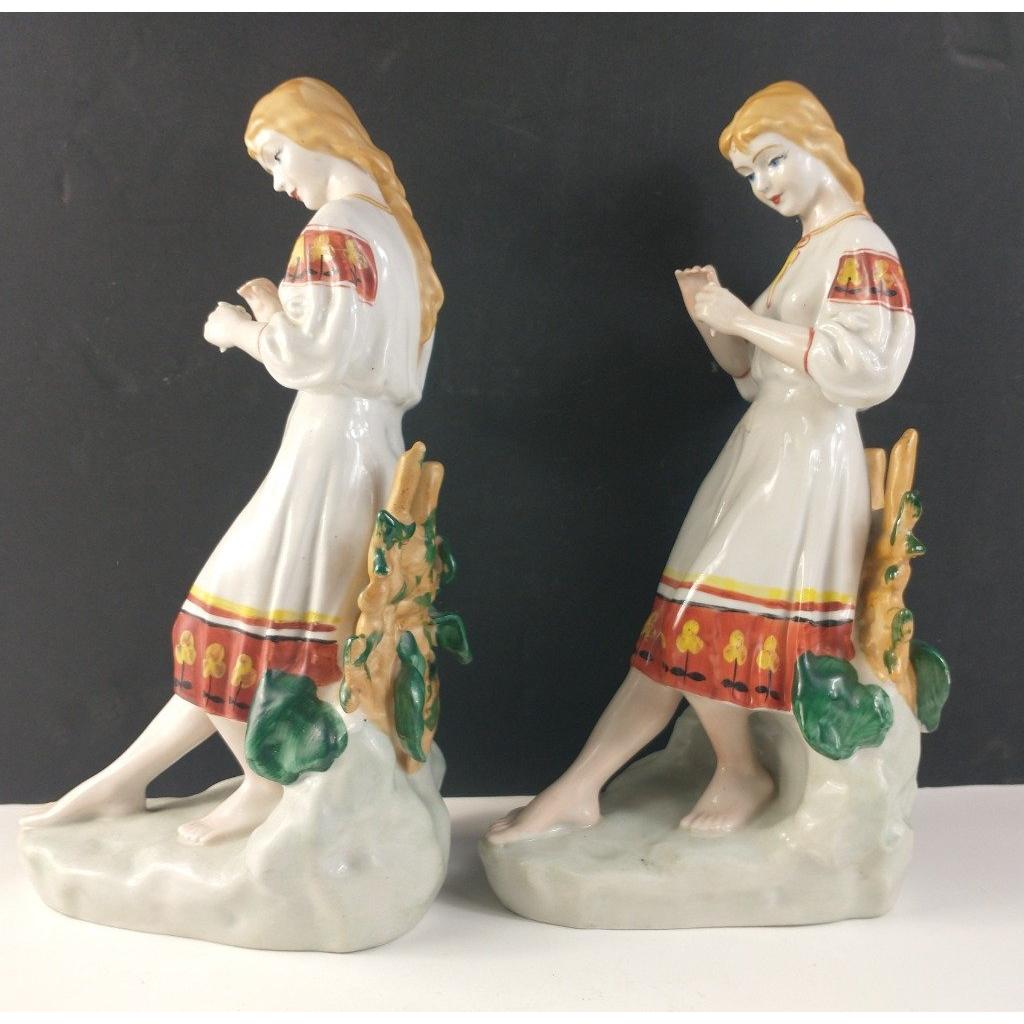 A pair of "Made in USSR" ceramic hand-painted female figurines delicately picking daisy "He loves me/he loves me not" petals. Approx. L16cm x H30cm.Approx 2 pieces