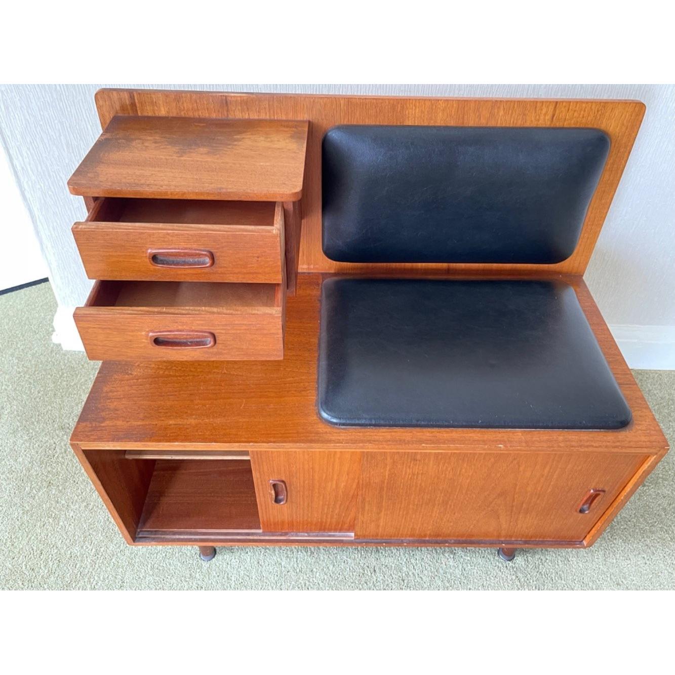 A RETRO teak hall telephone or lounge seat with faux black leather seat and back pads - 3ft in length x 18" depth
