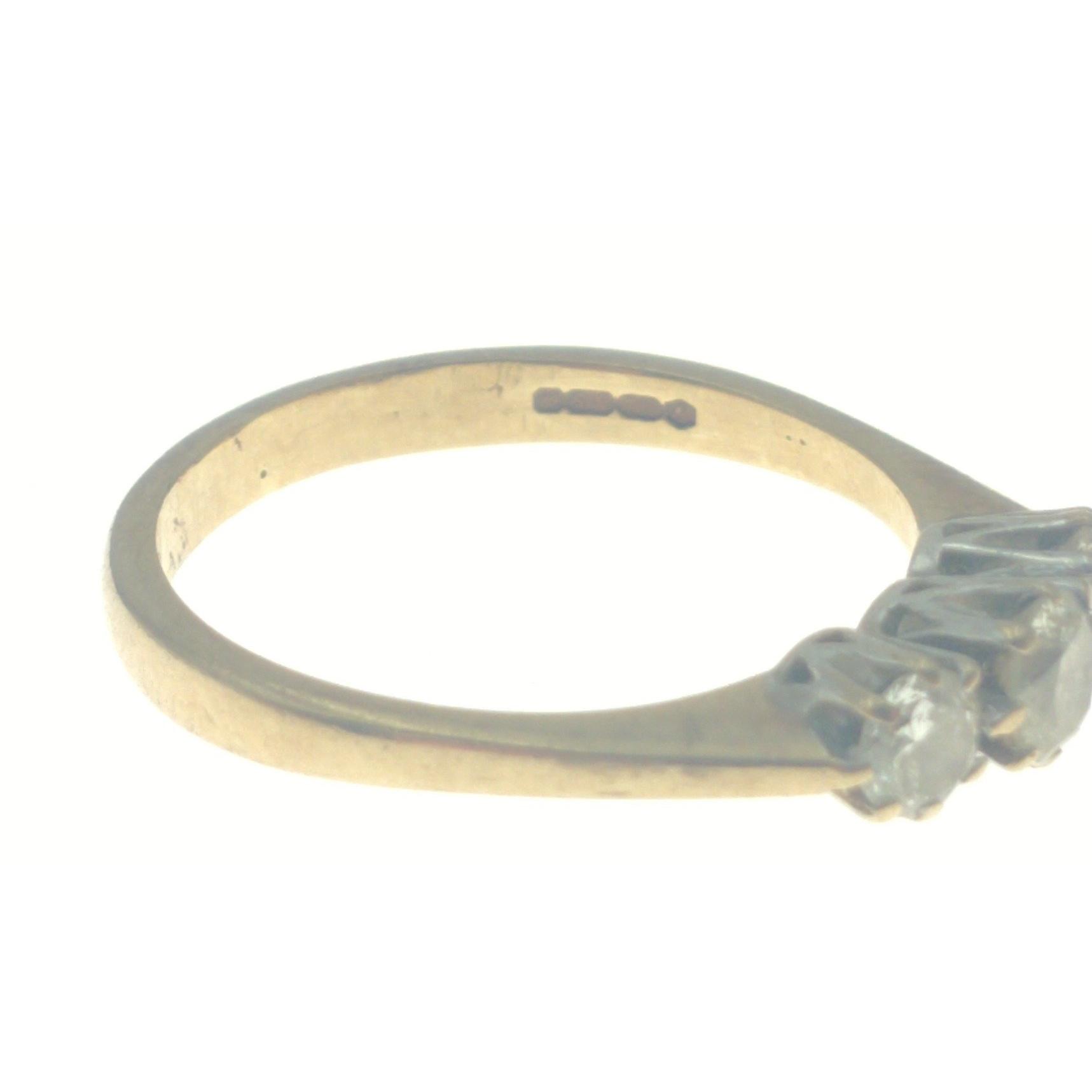 A stunning three diamond 9ct fully hallmarked antique gold ring in lovely condition. The largest centre stone has a diameter of approx 3mm. Ring Size N and weighs 2.3g approx. A truly lovely classical ring with good stones that sparkles well.
