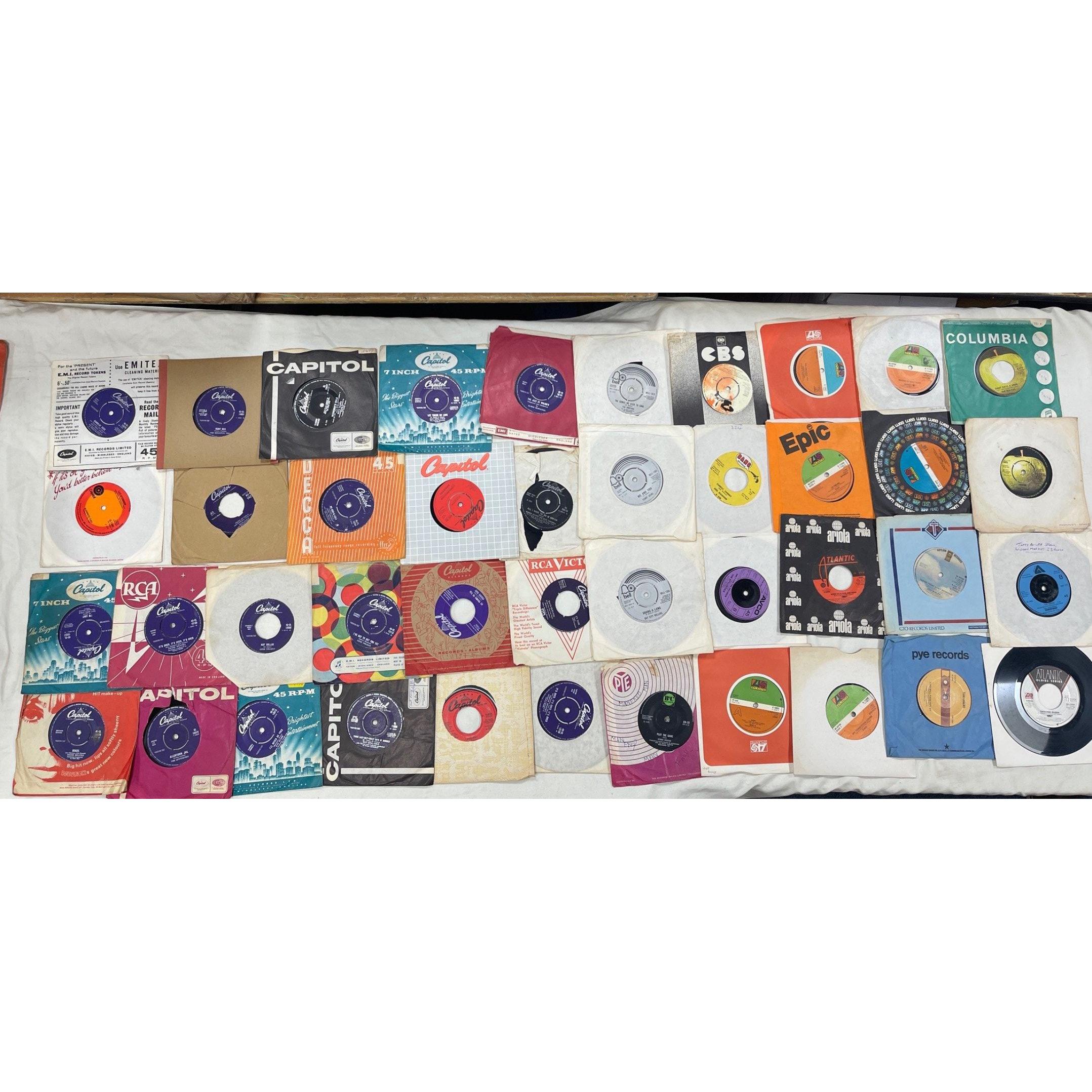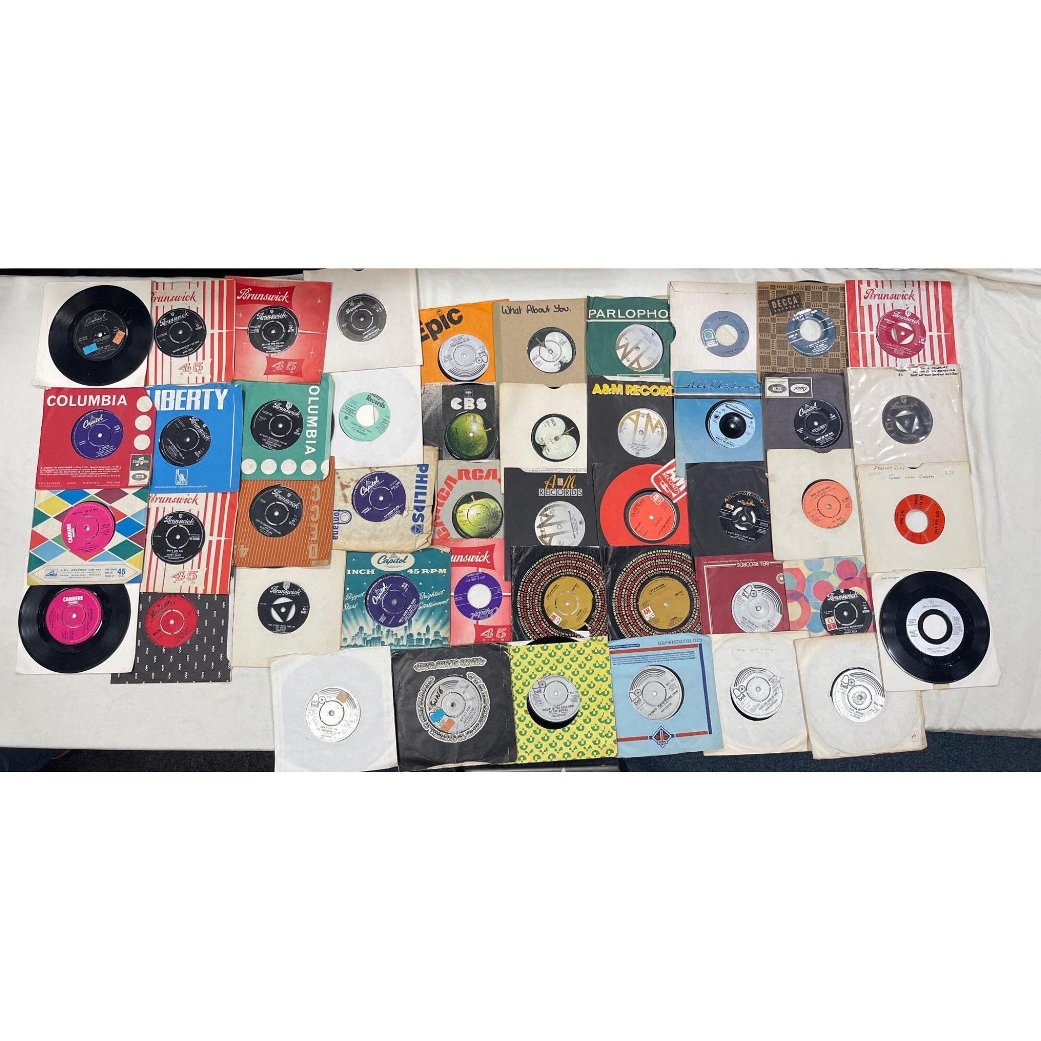 Lot of over 110 45rpm vinyl records from various recording studios including ABC PARAMOUNT, ALLPLATINUM, ALMO INTERNATIONAL, A&M RECORDS, AMPM, APPLE, ARISTA, ASYLUM, ATLANTIC, AVCO, BANG, BARCLAY, B&C, BELL, BIG WAY, BRUNSWICK, CANYON, CARRERE, CAPITOL, CBS, CHERRY, CHESS, CHINA AND CHRYSALIS and recording artists from the 1960s, 70s and 80s including Patsy Cline, Clout, Glen Campbell, The Tremeloes, Art Garfunkel, The Art of Noise and Martika among many others.