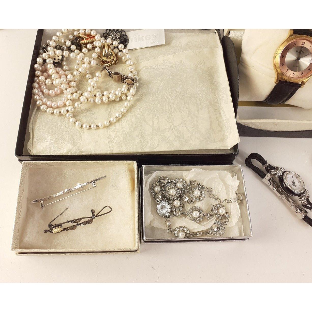 A collection of costume jewellery and watches to include a ladies cocktail watch from the METROPOLITAN MUSEUM OF ART, a boxed BERNEX watch with guarantee card with a rose and silver face (3cm dia), a ROTARY watch with a leather strap (3cm dia), 2 bar brooches, and a travel clock