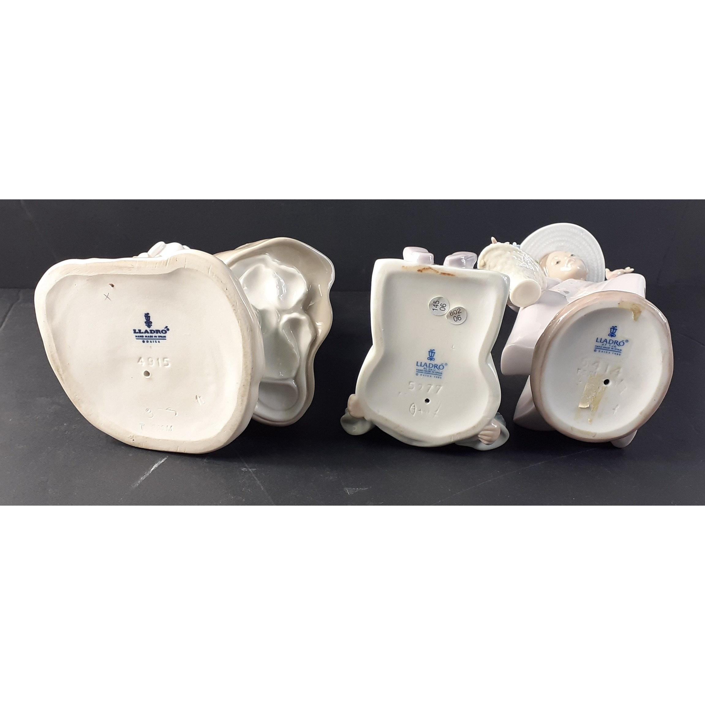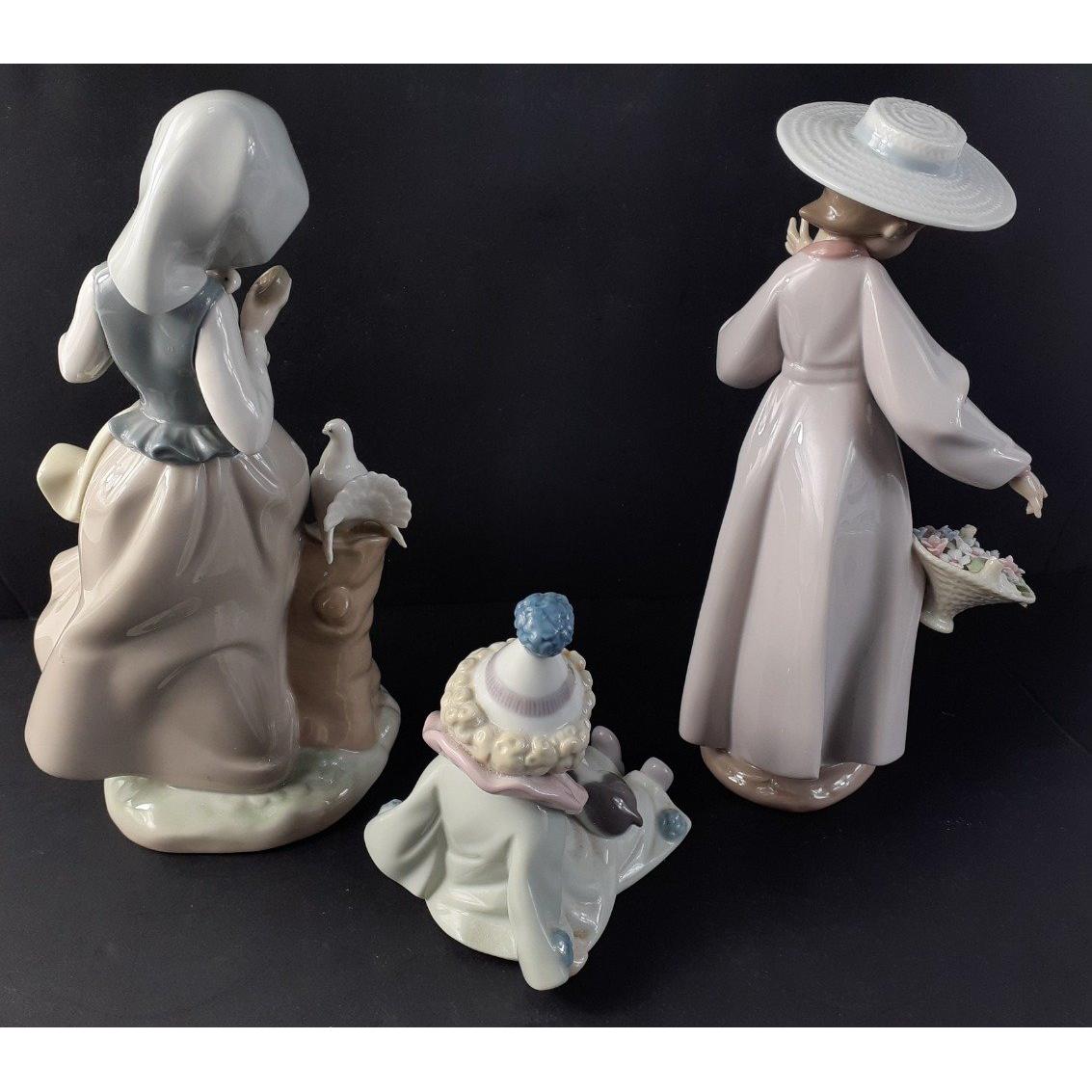 A group of LLADRO figurines to include a girl with doves (4915) standing 24cm high, no damage visible, a LLADRO CLOWN with a puppy sitting on his knee (10cm approx) with no damage, a LLADRO girl with basket (22cm high) with broken handle plus one other