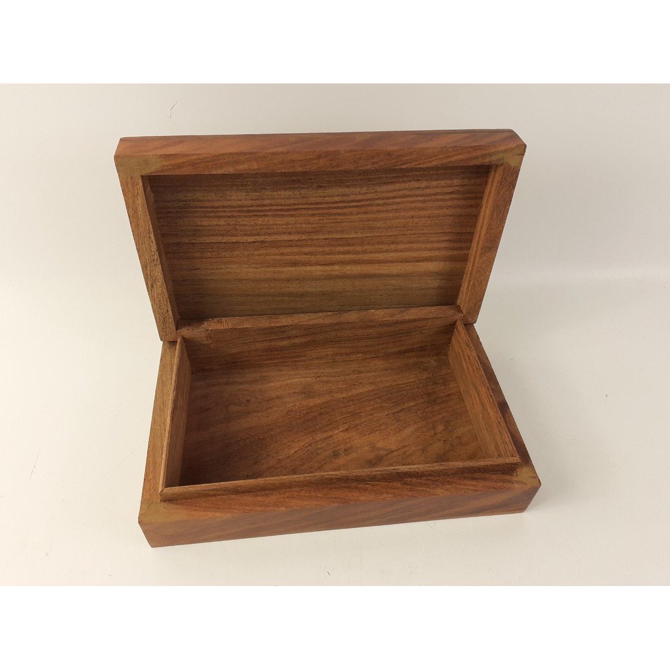 An attractive Indonesian hardwood box with decorative carving and brass inlay. Measurements are approx. 20cm in length by 12.5cm in width and 5cm in height.Approx 1 pieces