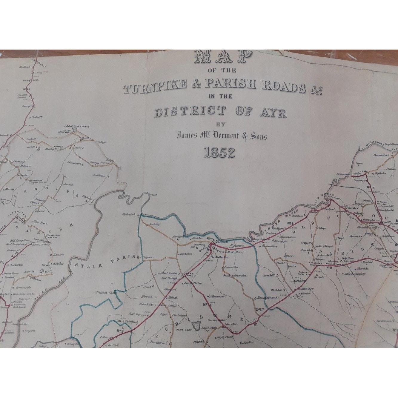 A hessian map dated 1852 of TURNPIKE & PARISH ROADS of AYR by James McDerment & Sons. Heavy centre fold, unframed. Colours still bright, a rare and interesting map. Measures 96 x 62cm approx.
