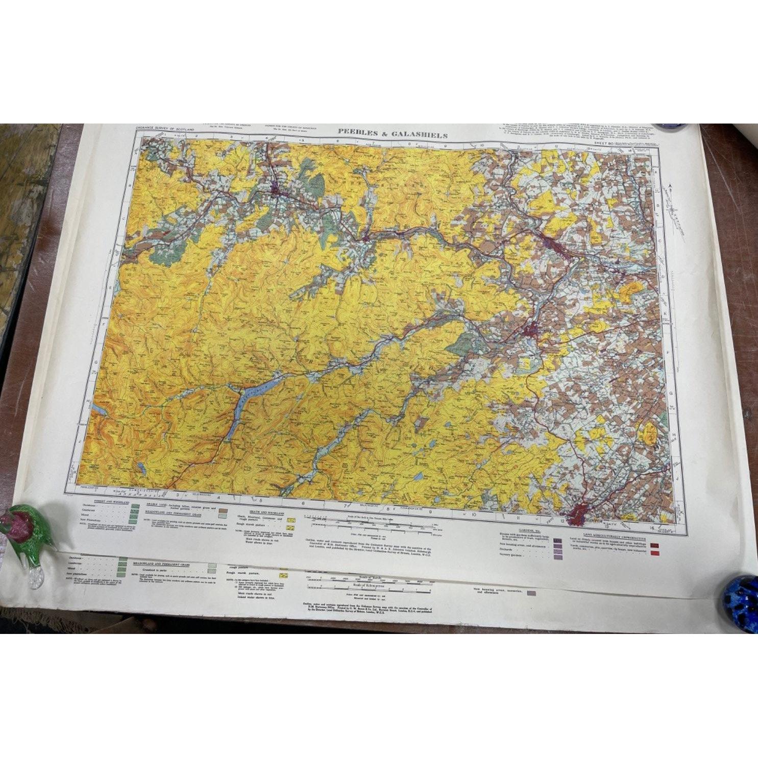 VINTAGE c1950's/60's COLOURFUL ORDNANCE SURVEY showing PEEBLES AND GALASHIELS and another showing EDINBURGH land utilisation survey maps - the Edinburgh map is on canvas style dimensions on larger Edin map 34"x 30" and the slightly smaller Peebles & Galashiels dimensions 26" wide x 33" width approx